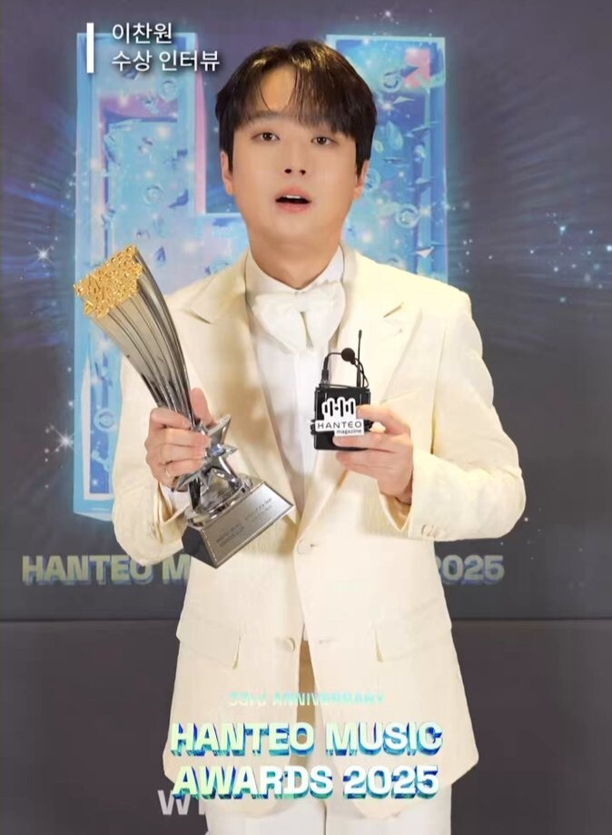 가수 **이찬원**이 진행자로 무대에 섰던 시상식에서 두 개의 트로피를 들고 백스테이지 인터뷰를 하는 순간이 찾아왔기 때문입니다.