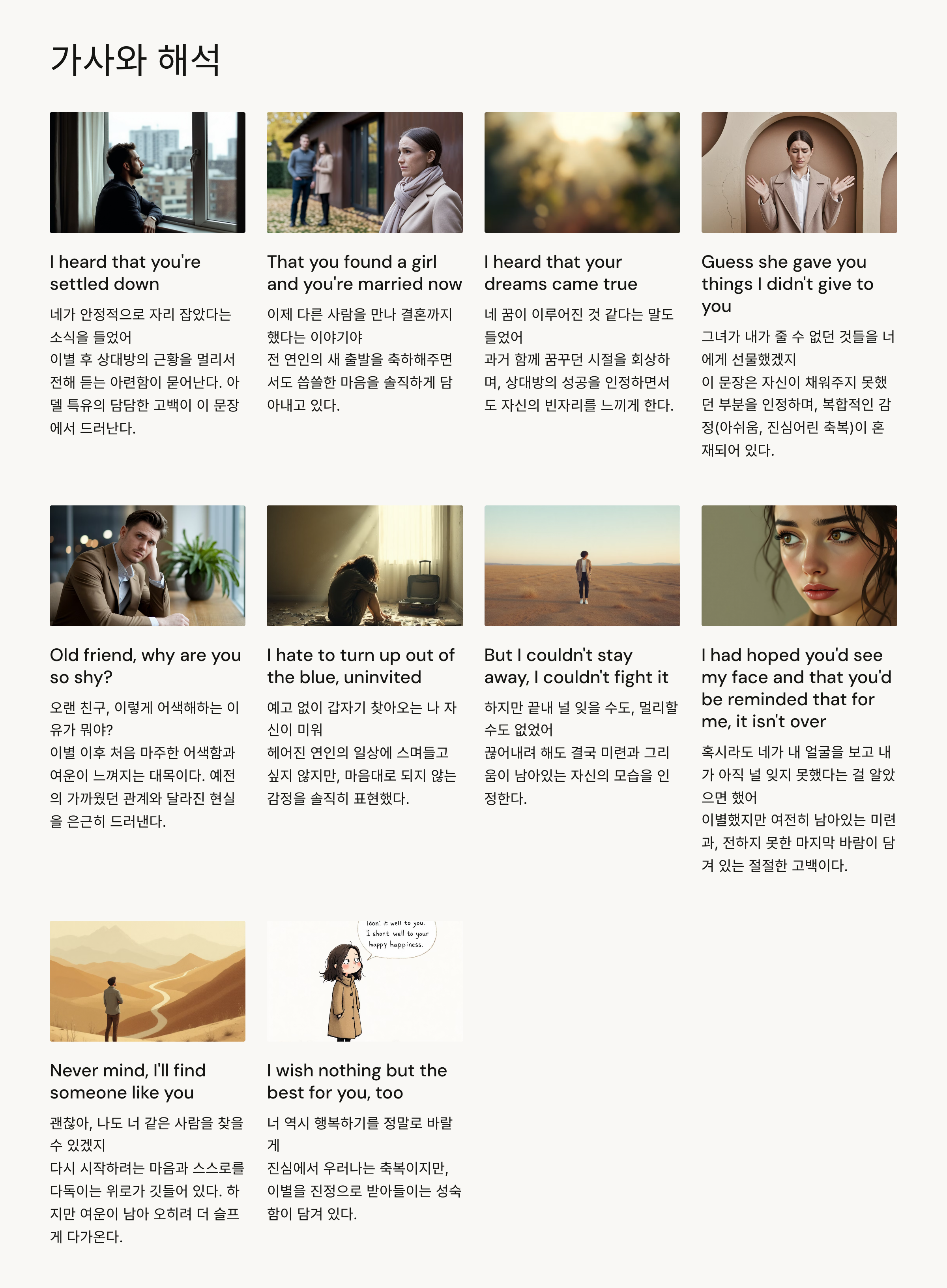 "Someone Like You"는 단지 이별에 관한 노래가 아니라, 그 슬픔을 마주하고 담담히 받아들이는 용기를 담은 곡입니다.