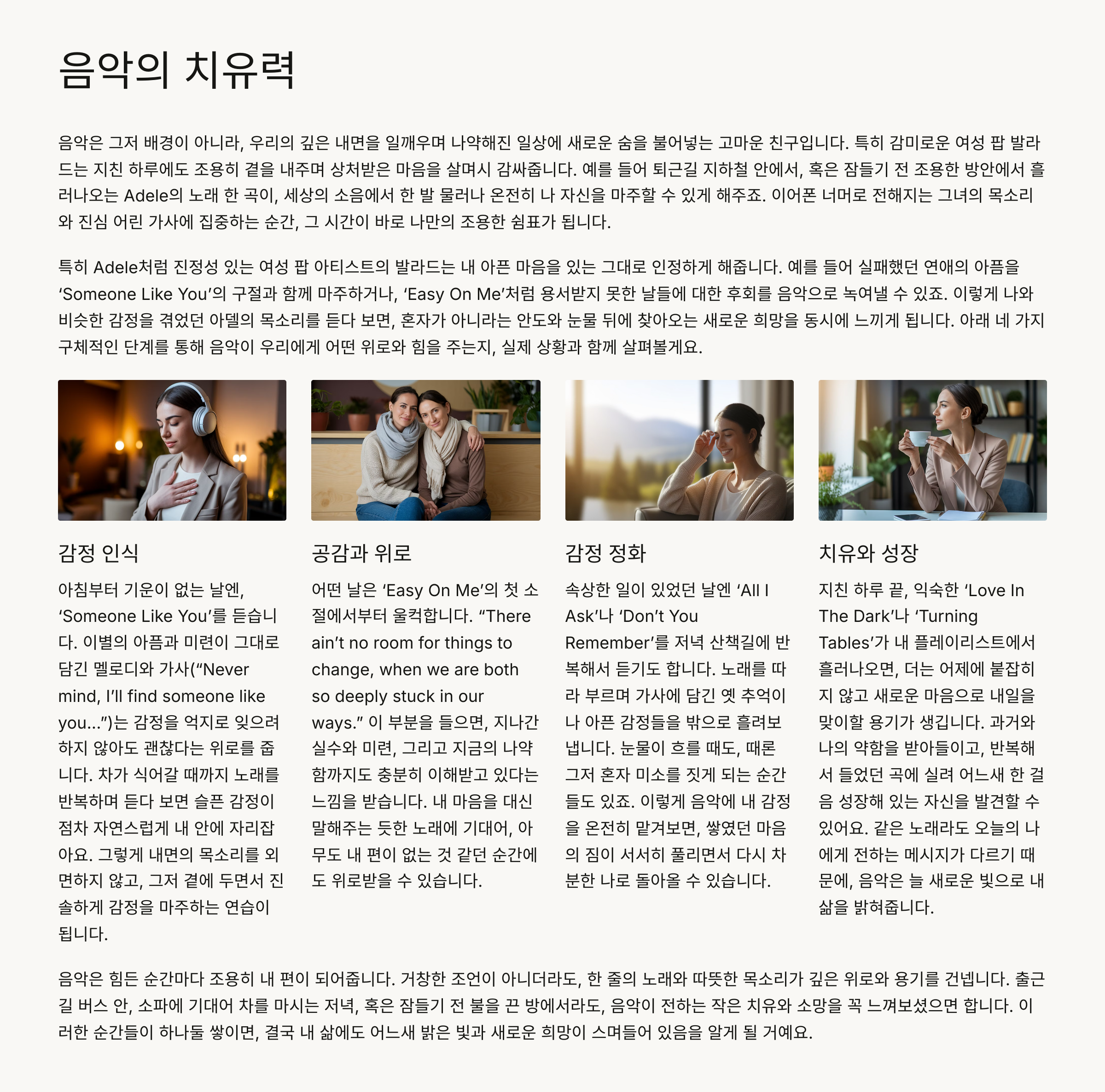 - 📝 감정을 글로 남겨보기: 듣고 느낀 감정을 일기처럼 메모해보세요. 정서 정리에 효과적입니다.