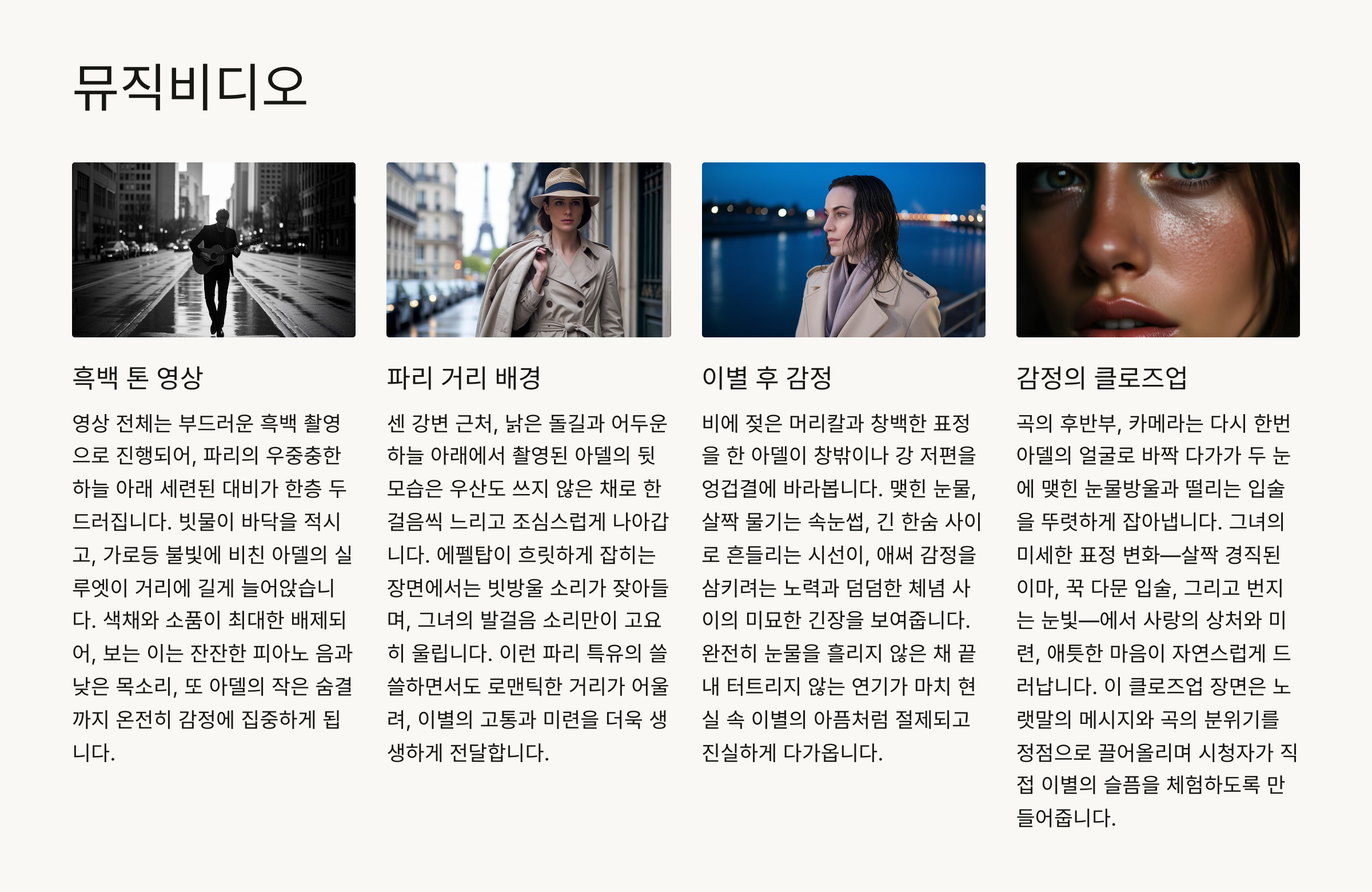 파리의 거리에서 홀로 걷는 아델의 모습은 이별 후의 쓸쓸함과 받아들임을 상징하죠.