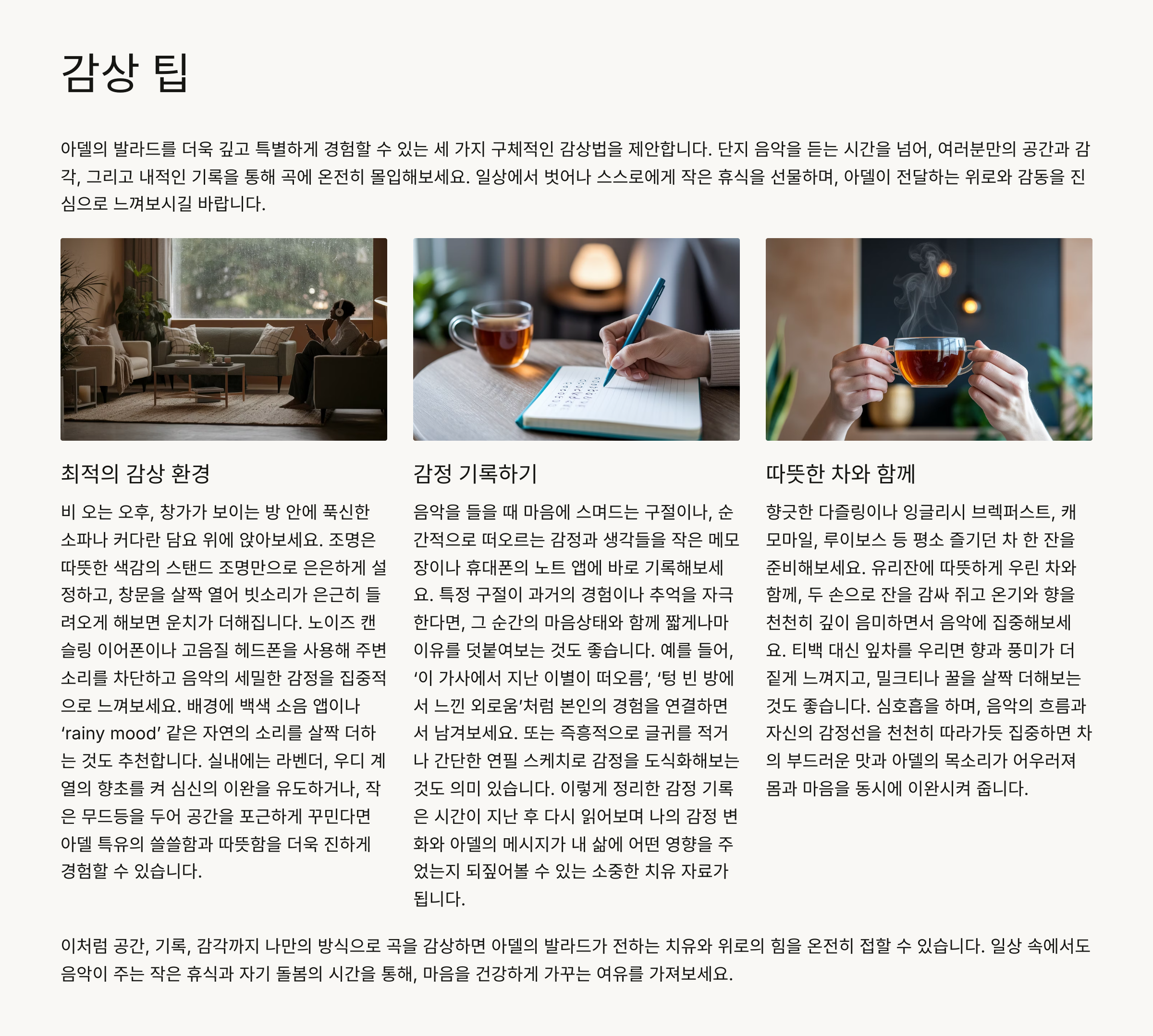 - 🎧 최적의 감상 환경: 조명이 어두운 방, 편안한 이어폰, 혼자 있는 조용한 시간