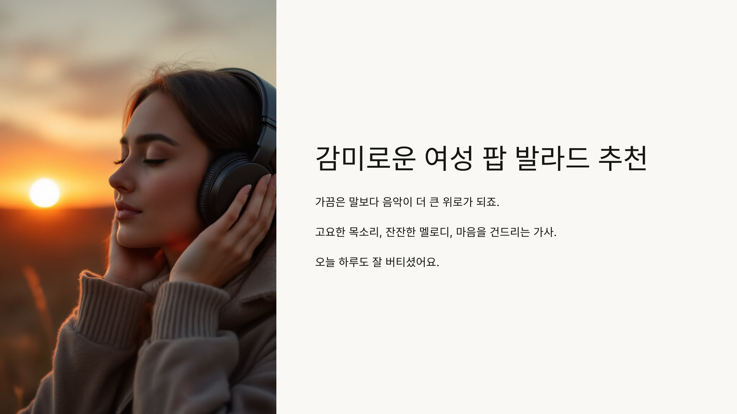 가끔은 말보다 음악이 더 큰 위로가 되죠. 고요한 목소리, 잔잔한 멜로디, 마음을 건드리는 가사 하나에 하루의 끝이 조금은 부드러워지는 걸 느낍니다.