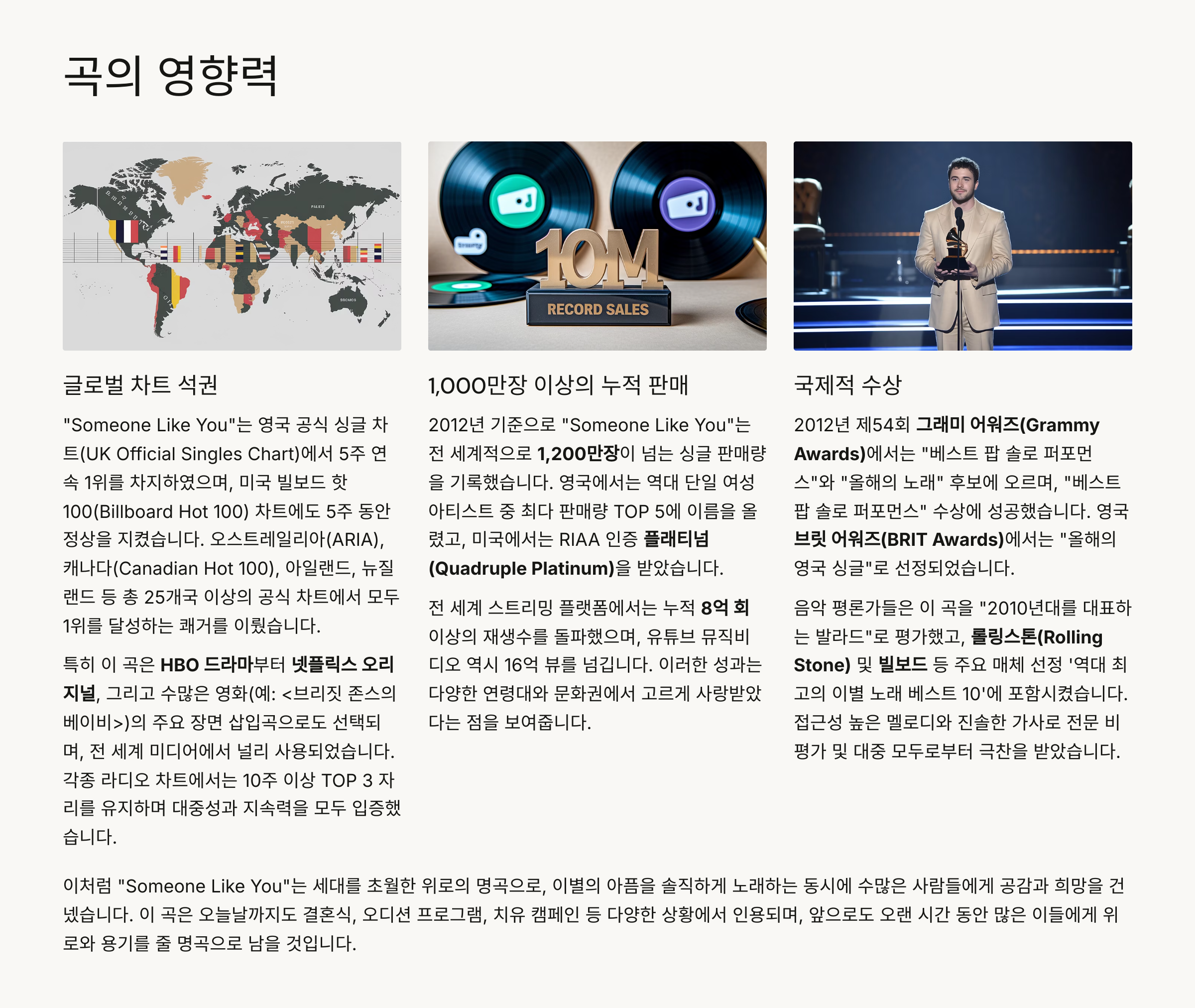아델은 이 곡을 통해 단순한 이별 노래를 넘어서, 모든 이별을 경험한 이들의 마음을 대변하는 곡으로 자리매김했죠.