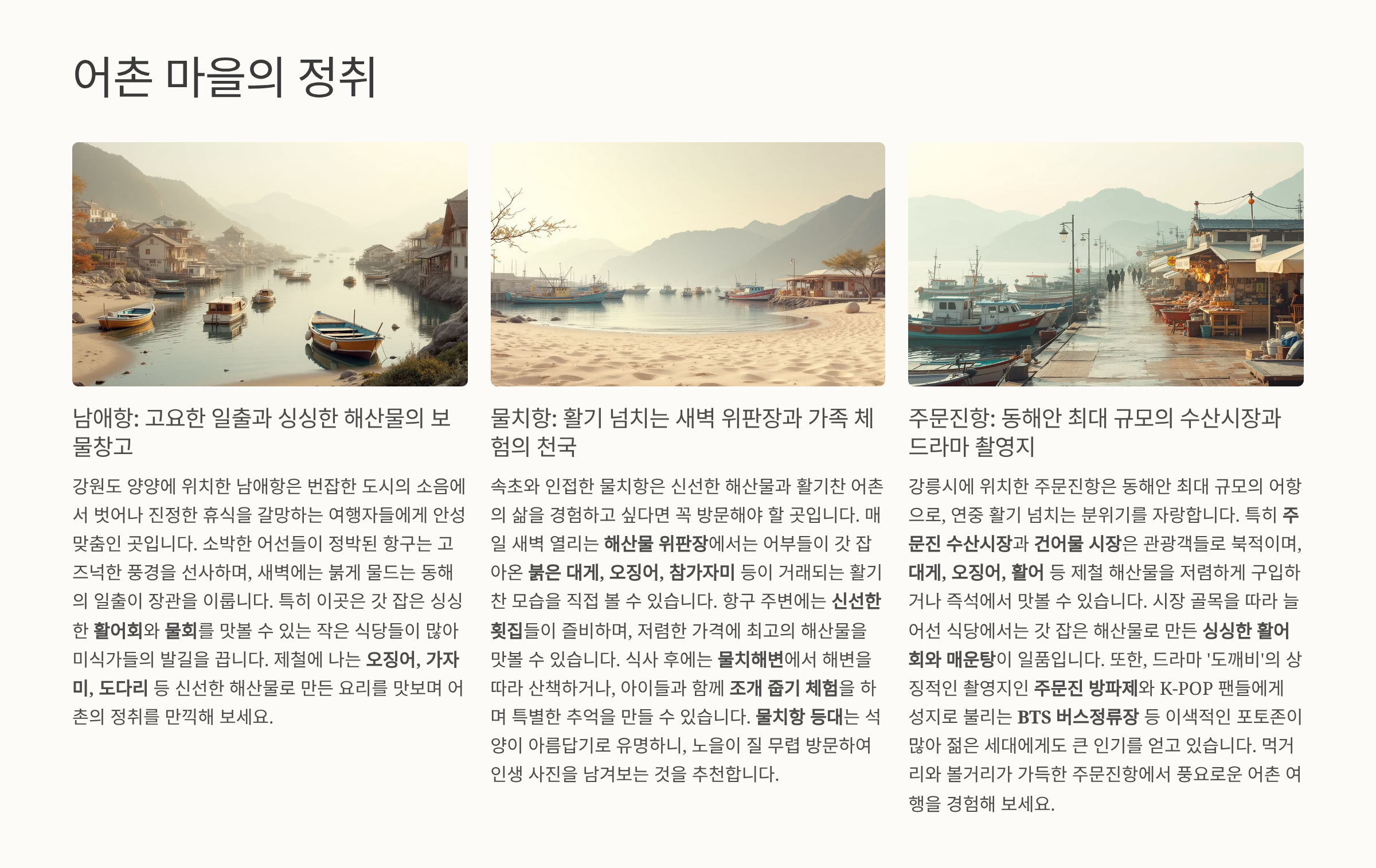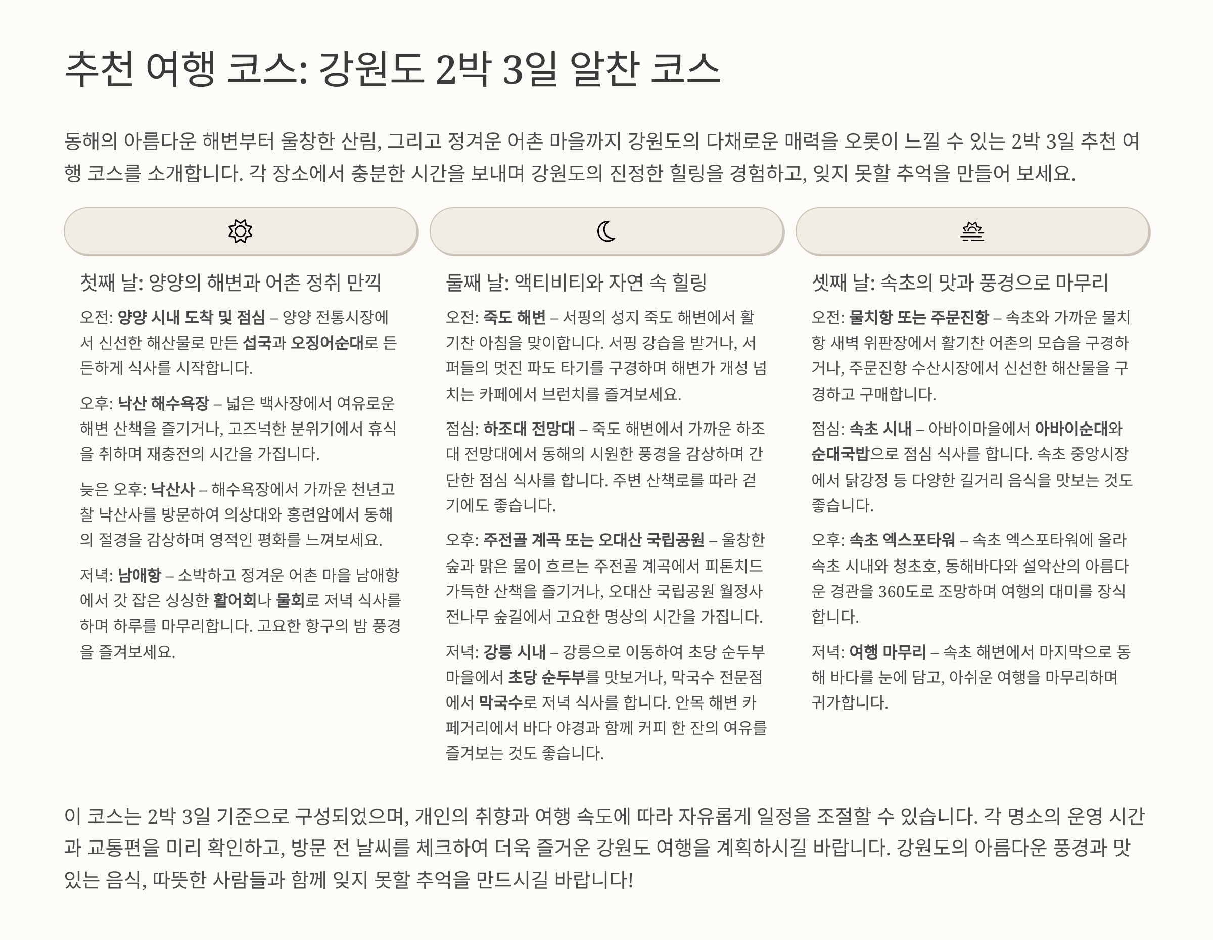 이 경로를 따라 1박 2일 또는 2박 3일 여행을 계획해 보세요. 자연과 바다를 함께 즐길 수 있어 최고의 힐링 코스가 될 거예요.