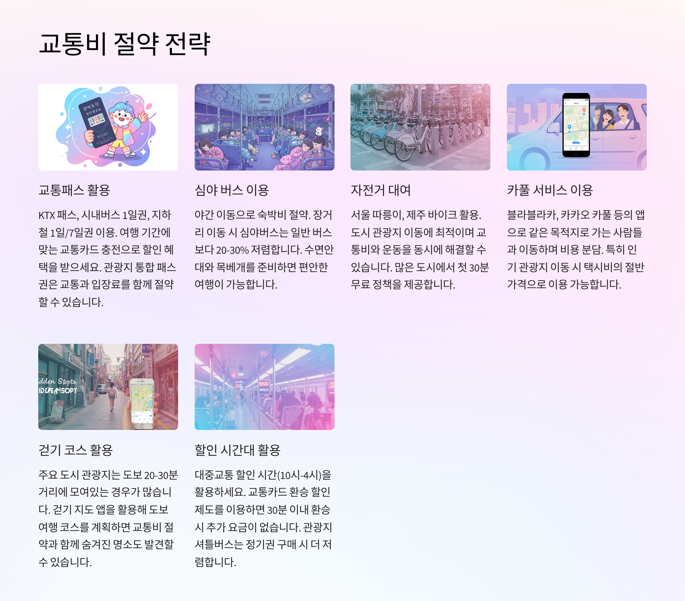 | 교통패스 활용 | KTX 패스, 시내버스 1일권 등을 이용하면 개별 요금보다 저렴 |