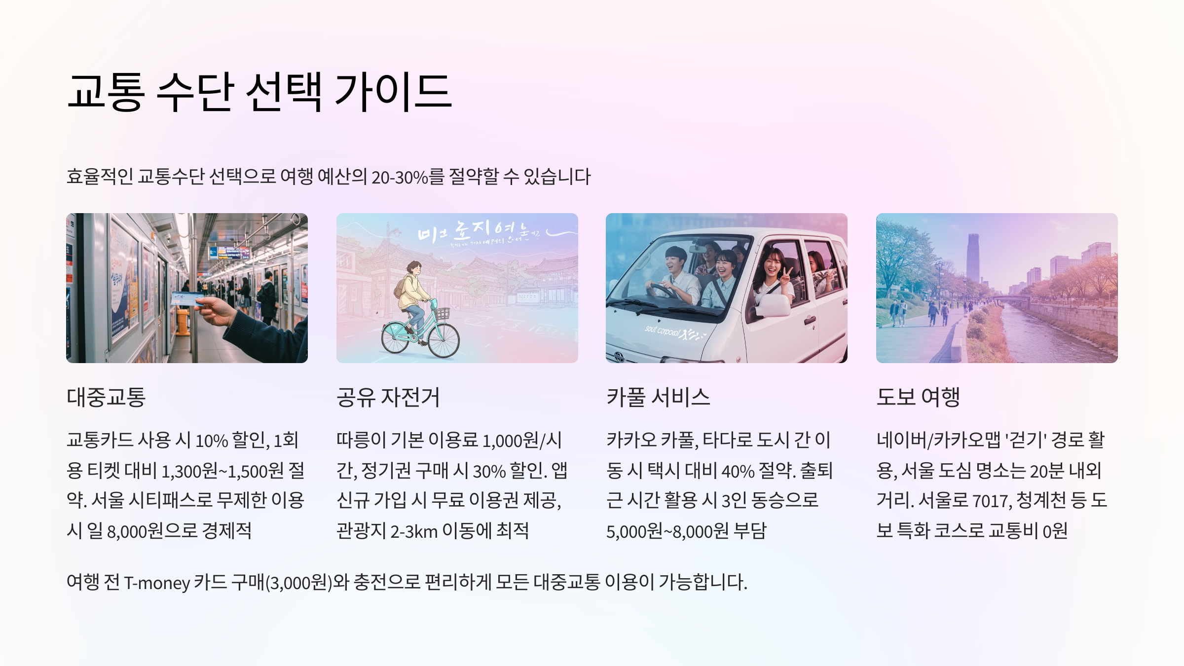 여행에서 가장 큰 비용 중 하나가 교통비죠. 하지만 미리 계획하고 스마트하게 이동하면 꽤 많은 돈을 아낄 수 있어요. 혼자 여행할 때 교통비를 줄이는 방법을 알려드릴게요!