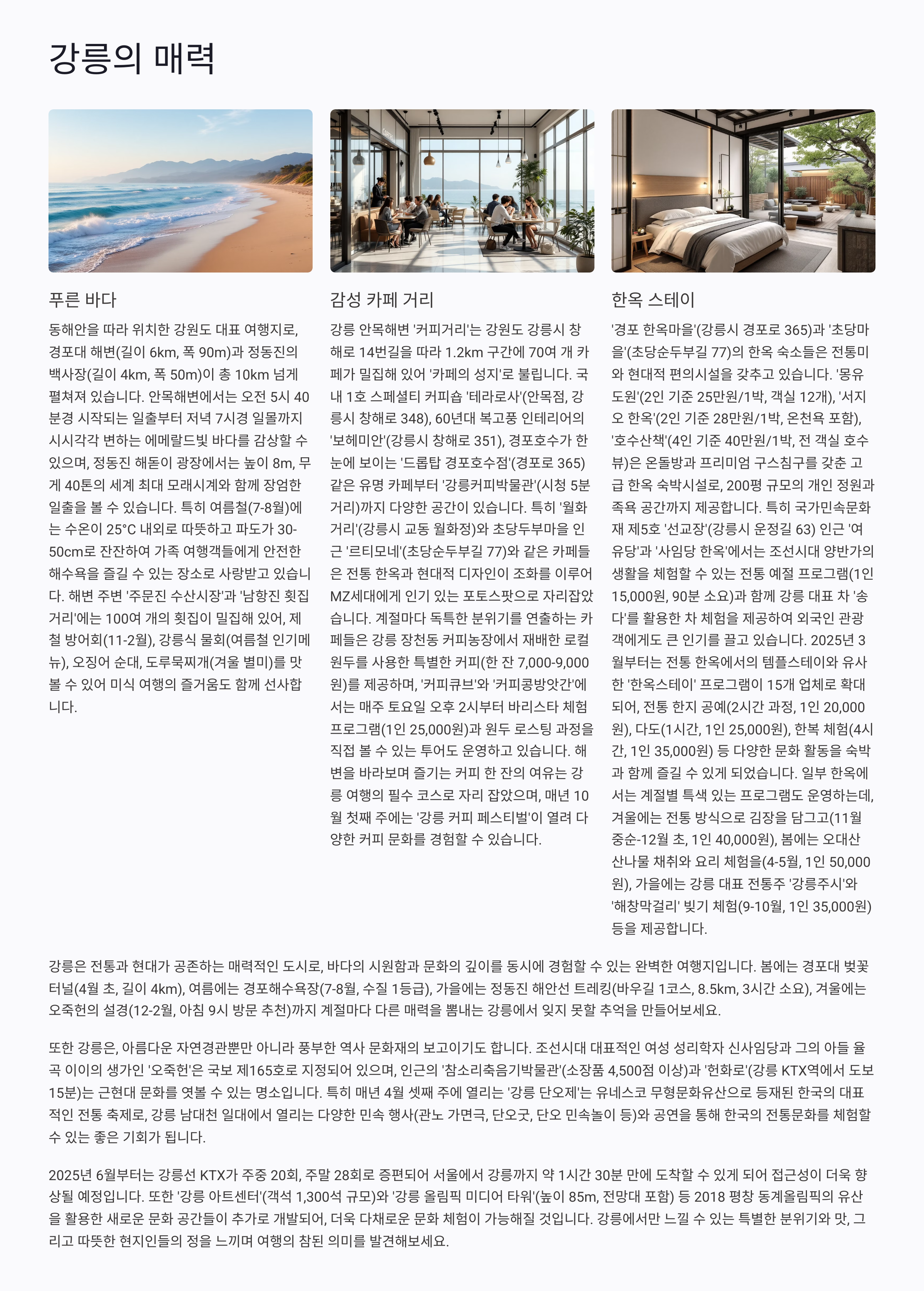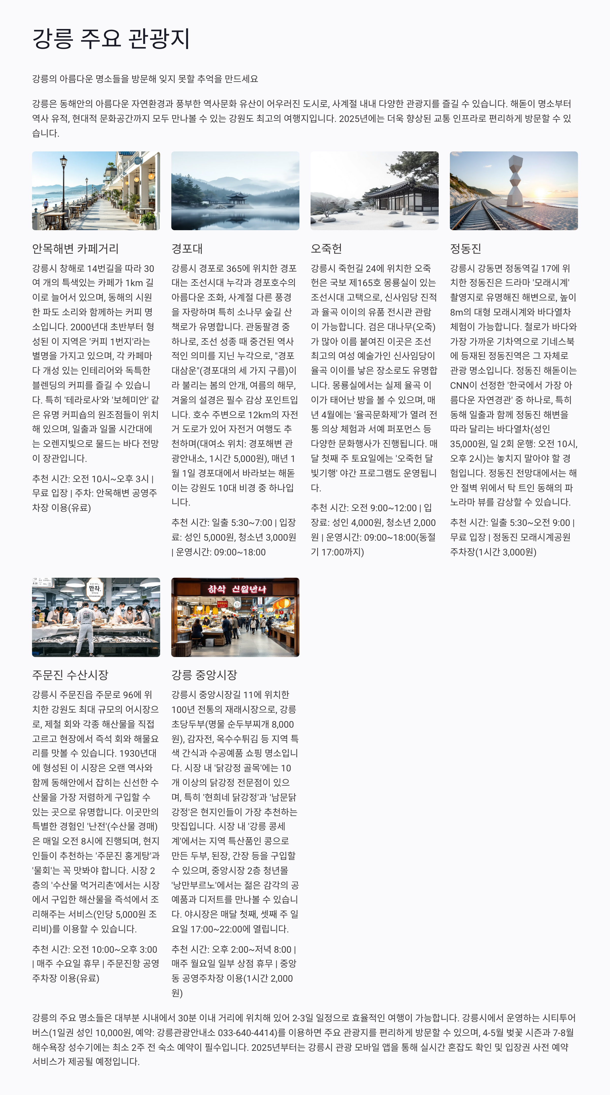 2025년 현재, 강릉은 안목 해변과 경포호수, 강릉 오죽헌 등 전통과 현대가 조화를 이루는 명소로 주목받고 있어요.