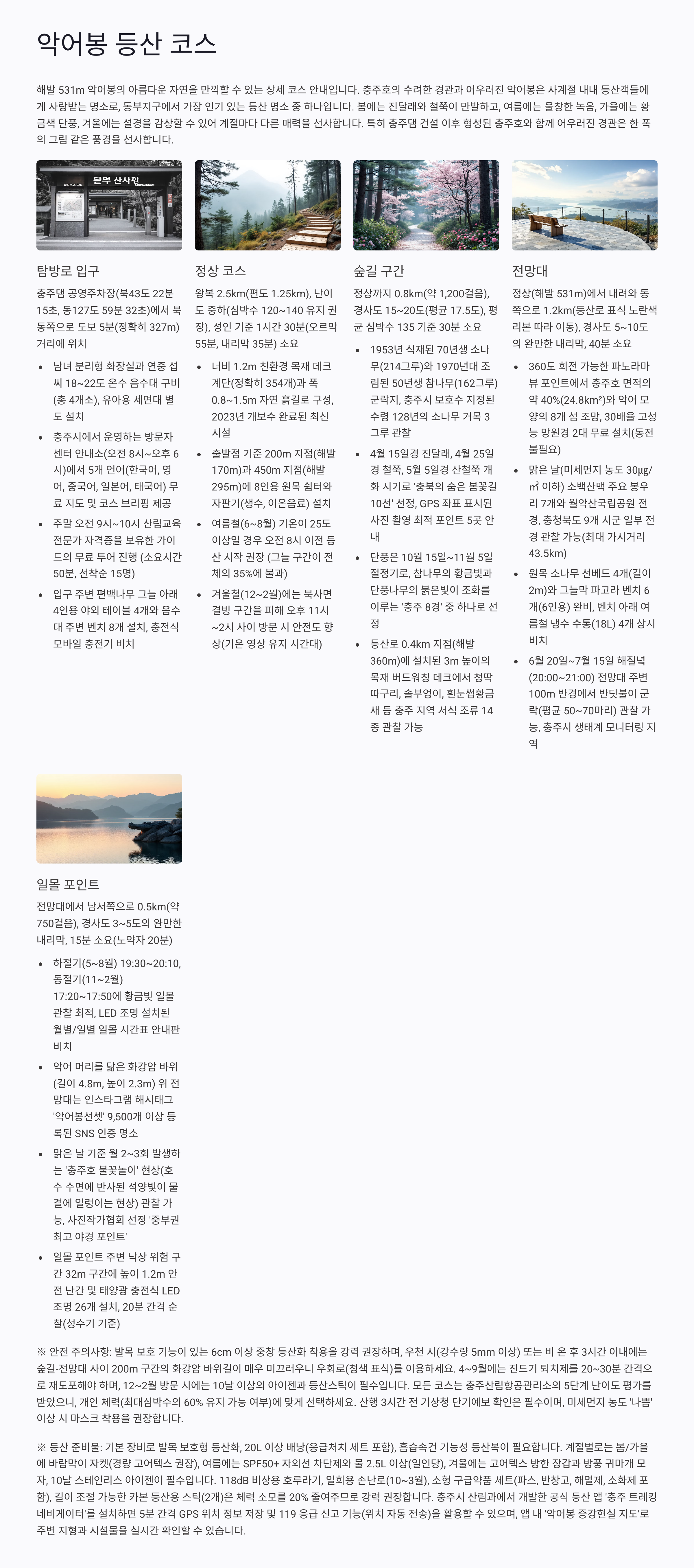 - 가벼운 등산화 착용을 추천드려요. 계단 구간이 많아 운동화는 미끄러울 수 있어요.