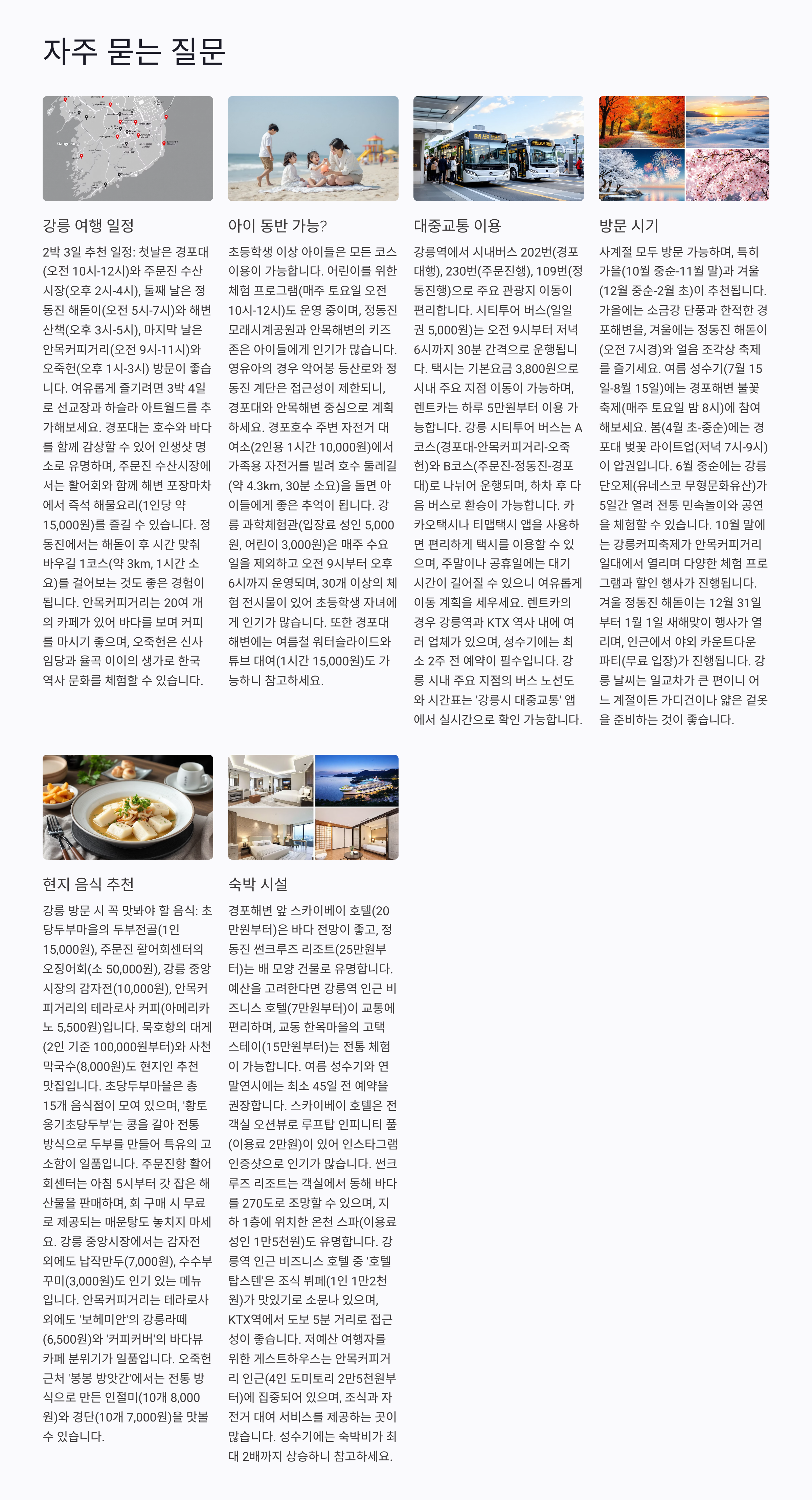 강릉 시내 및 주요 관광지 간에는 버스 노선이 잘 연결되어 있어 대중교통으로도 충분히 여행이 가능합니다.