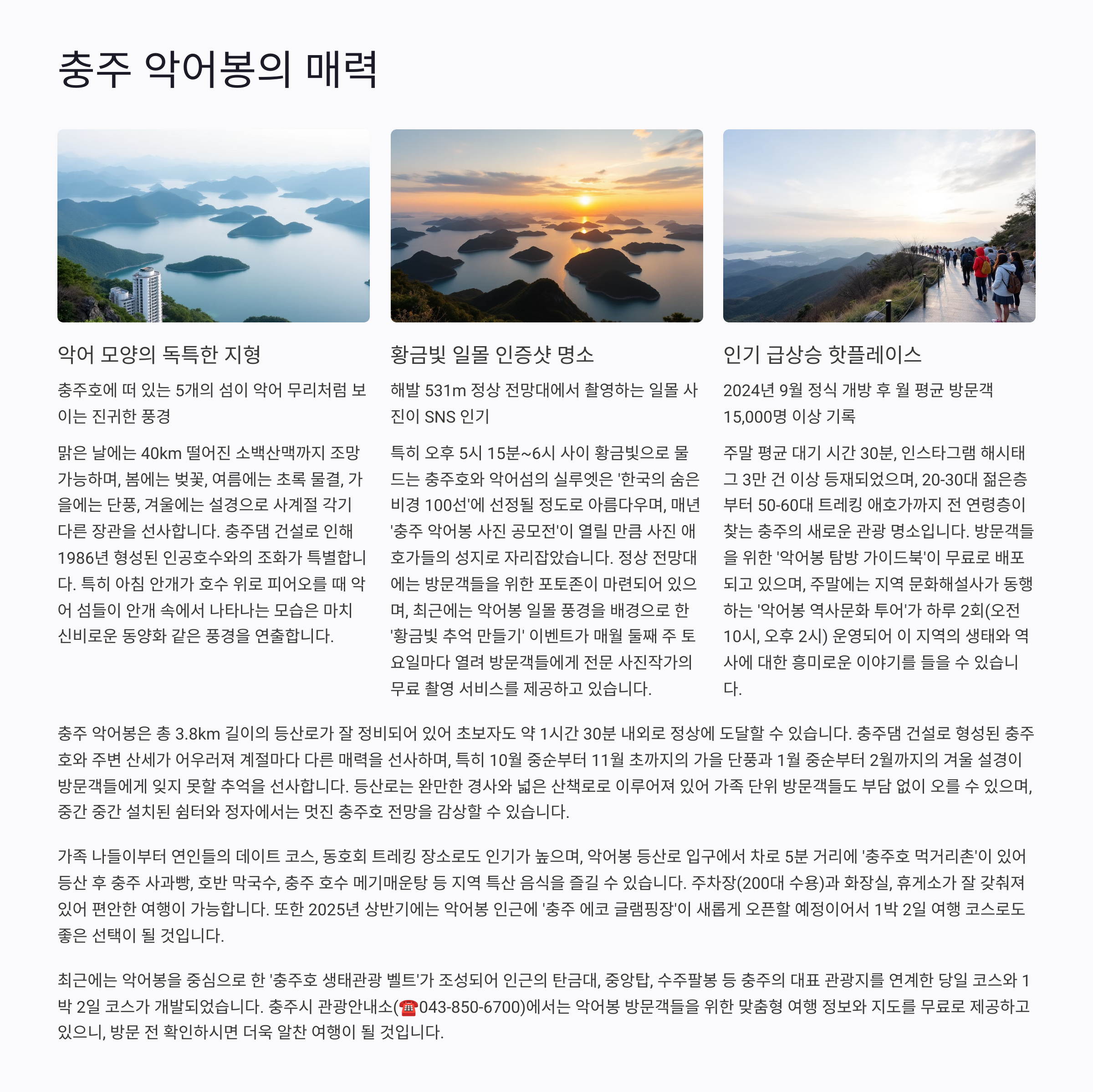 강릉의 푸른 바다와 감성 카페 거리, 충주 악어봉의 장쾌한 풍경과 힐링 트레킹 코스는 누구에게나 잊지 못할 추억이 되어줄 거예요.