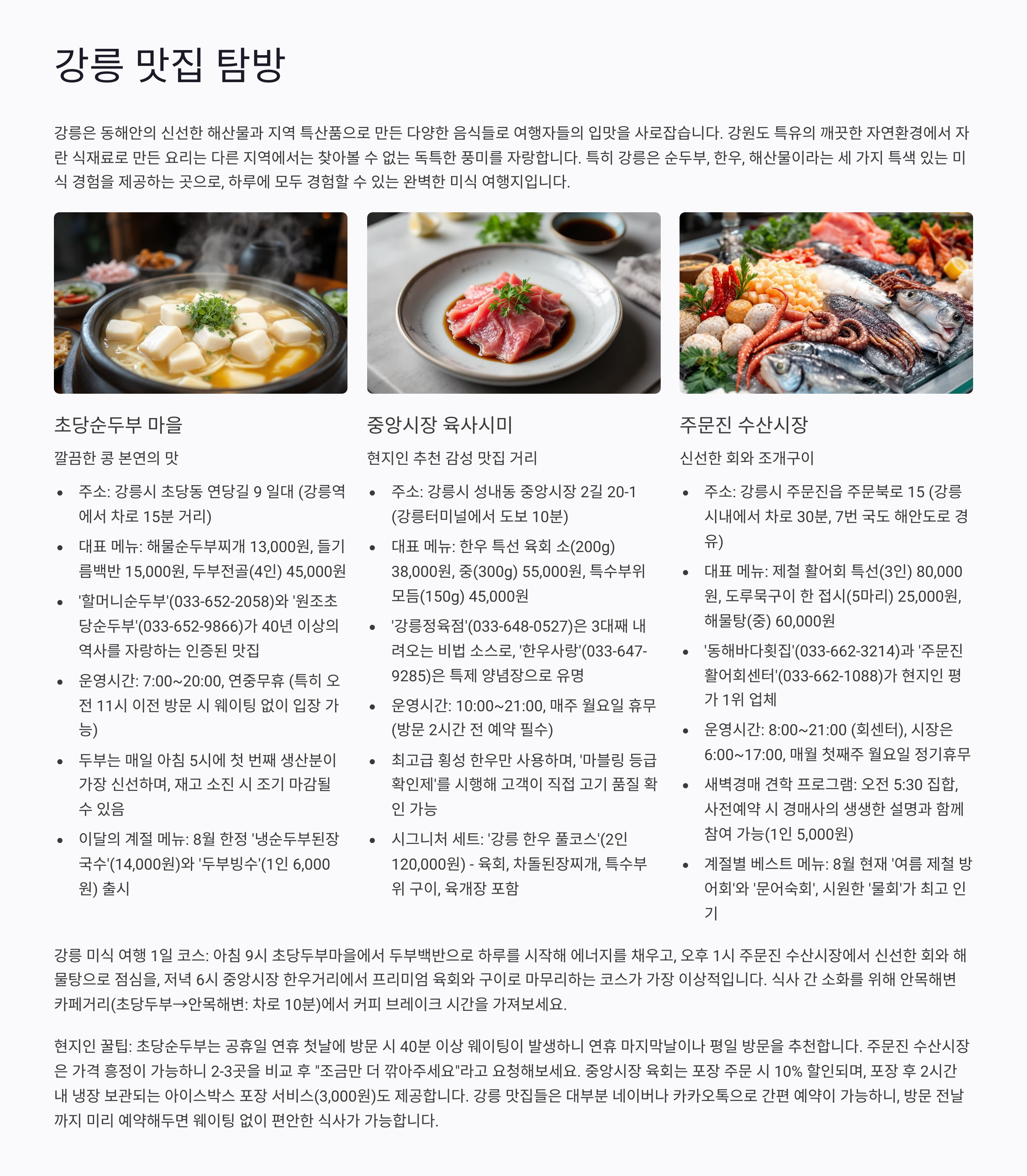- 초당순두부 마을: 깔끔한 콩 본연의 맛을 느낄 수 있는 순두부