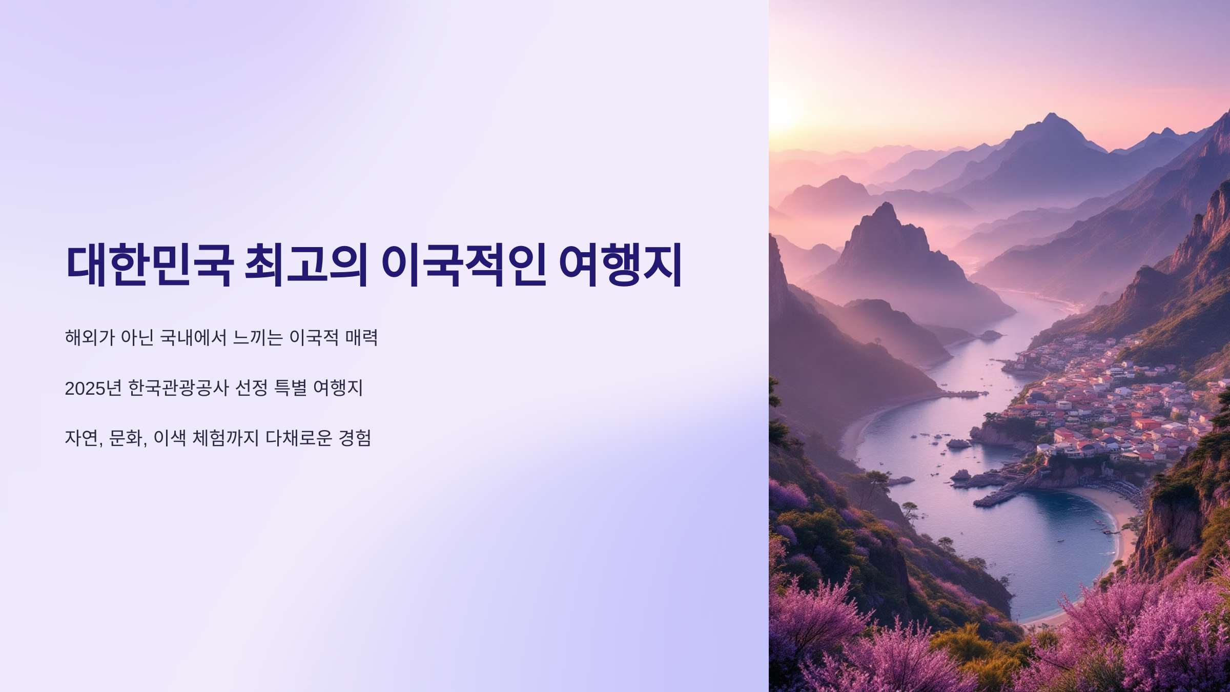 한국관광공사가 2025년 기준으로 선정한 '대한민국 최고의 이국적인 여행지'는 자연경관부터 문화유산, 이색적인 체험까지 다채로운 매력을 자랑합니다.