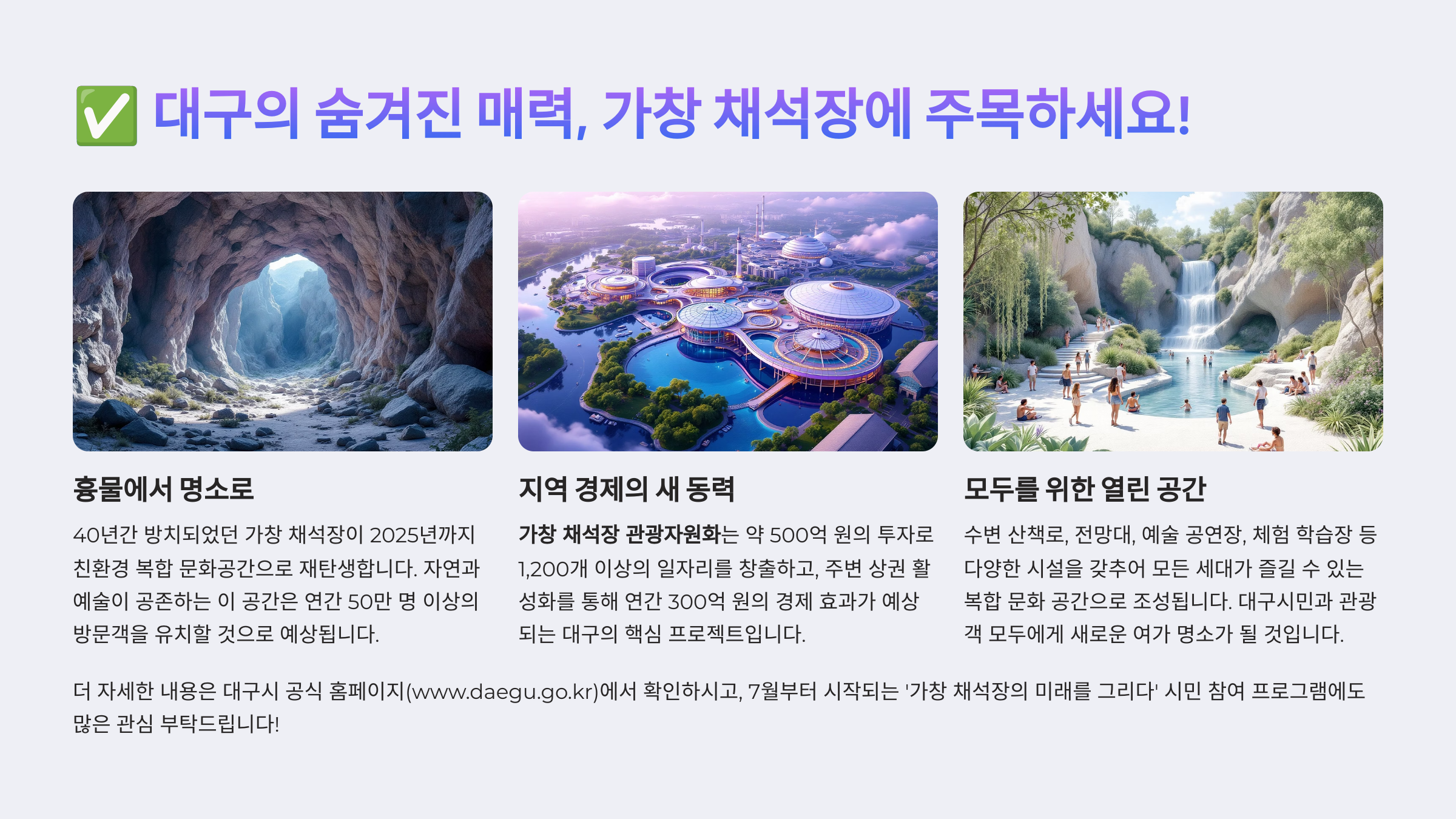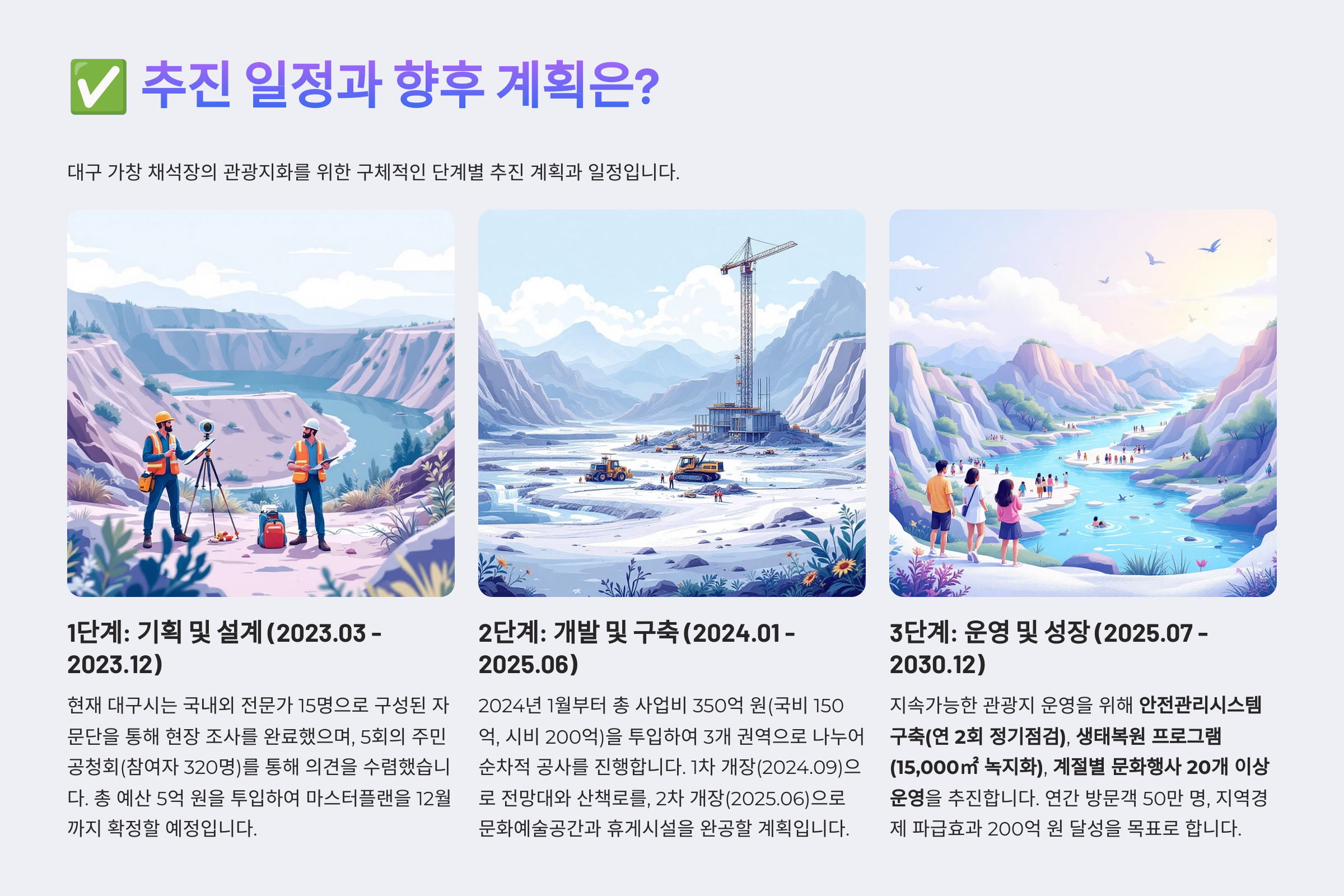 가창 채석장 관광자원화는 단순한 공간 개발을 넘어 대구 관광 산업의 패러다임을 바꾸는 중요한 프로젝트입니다.
