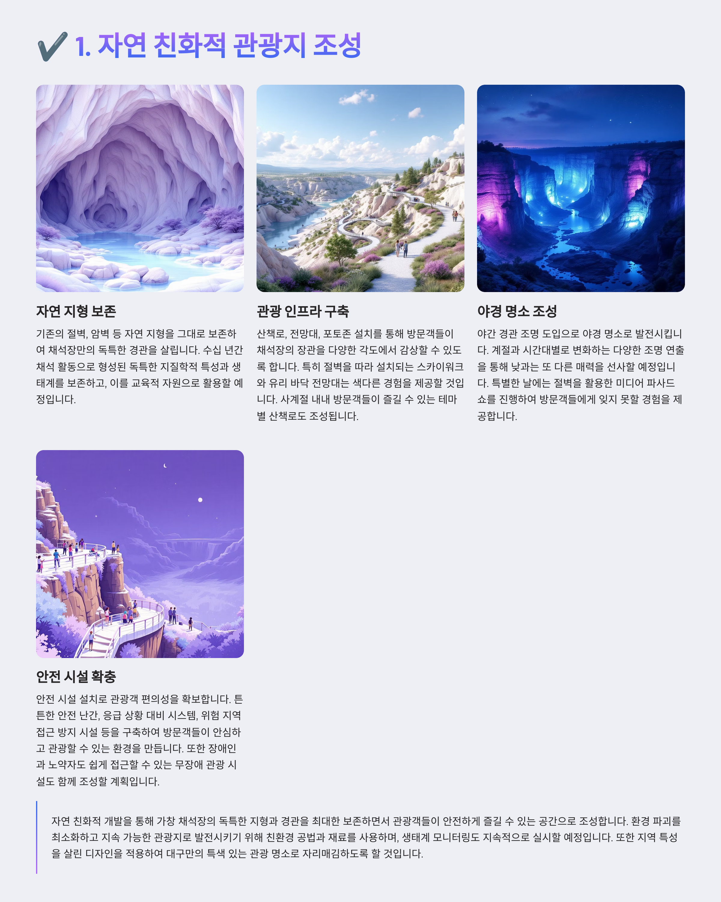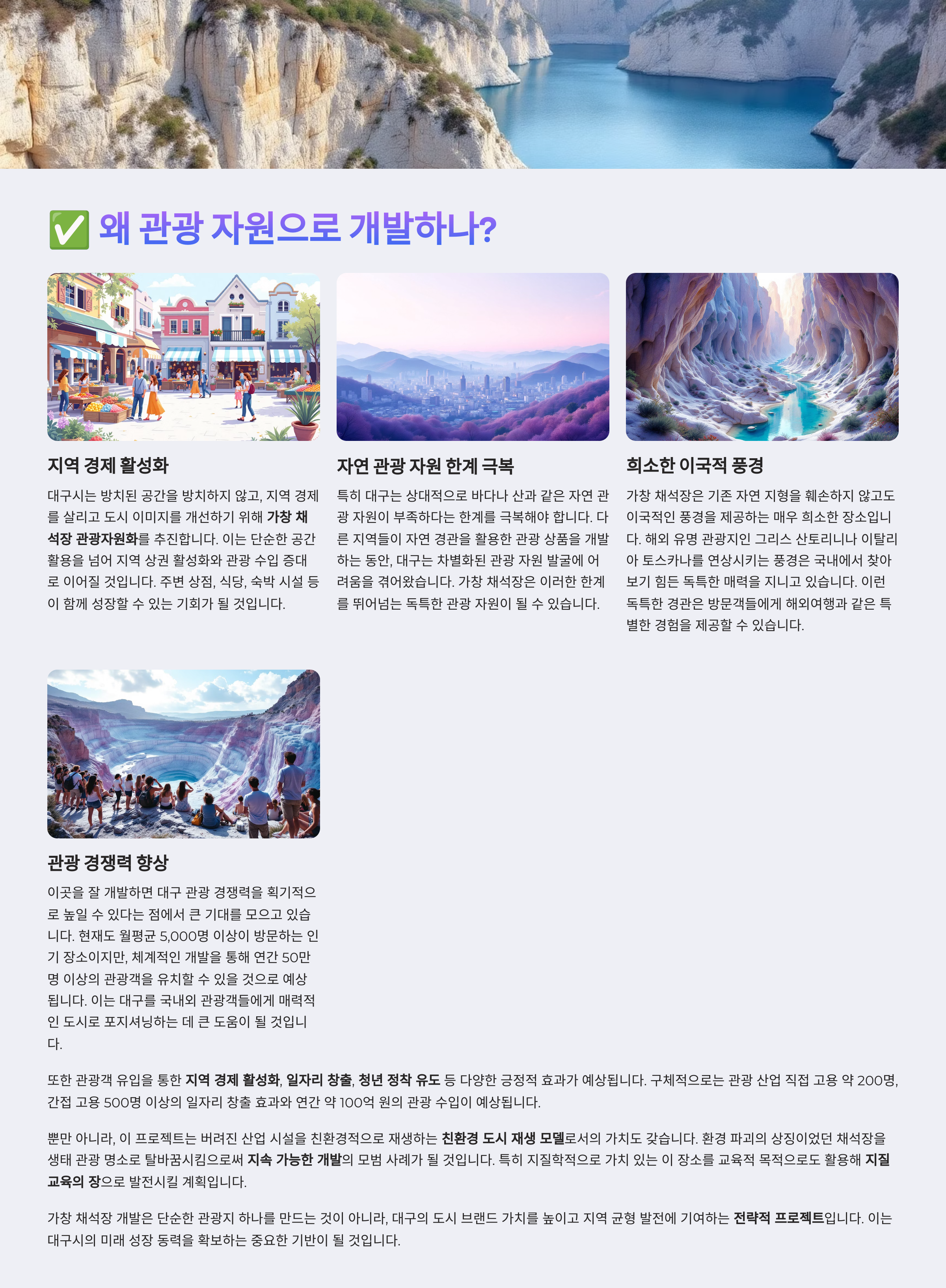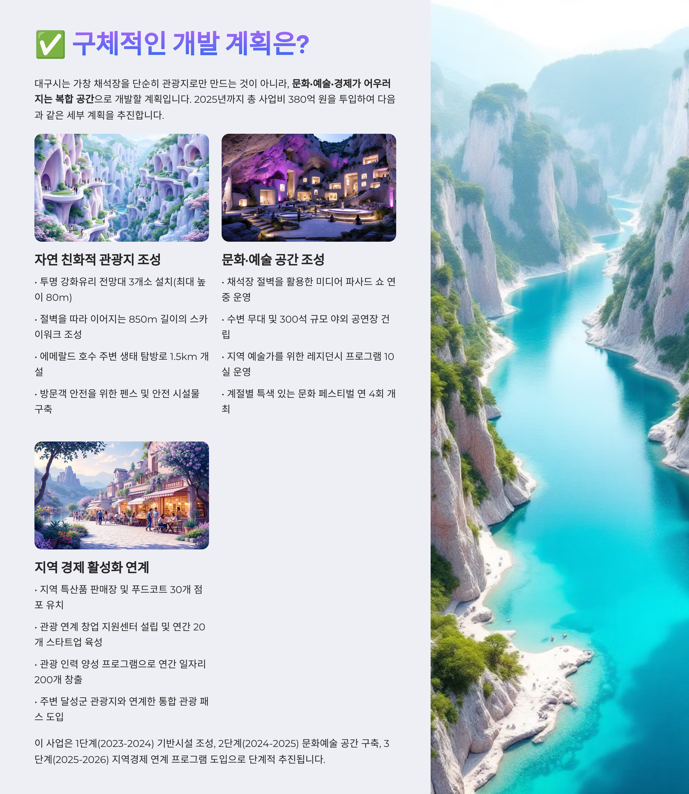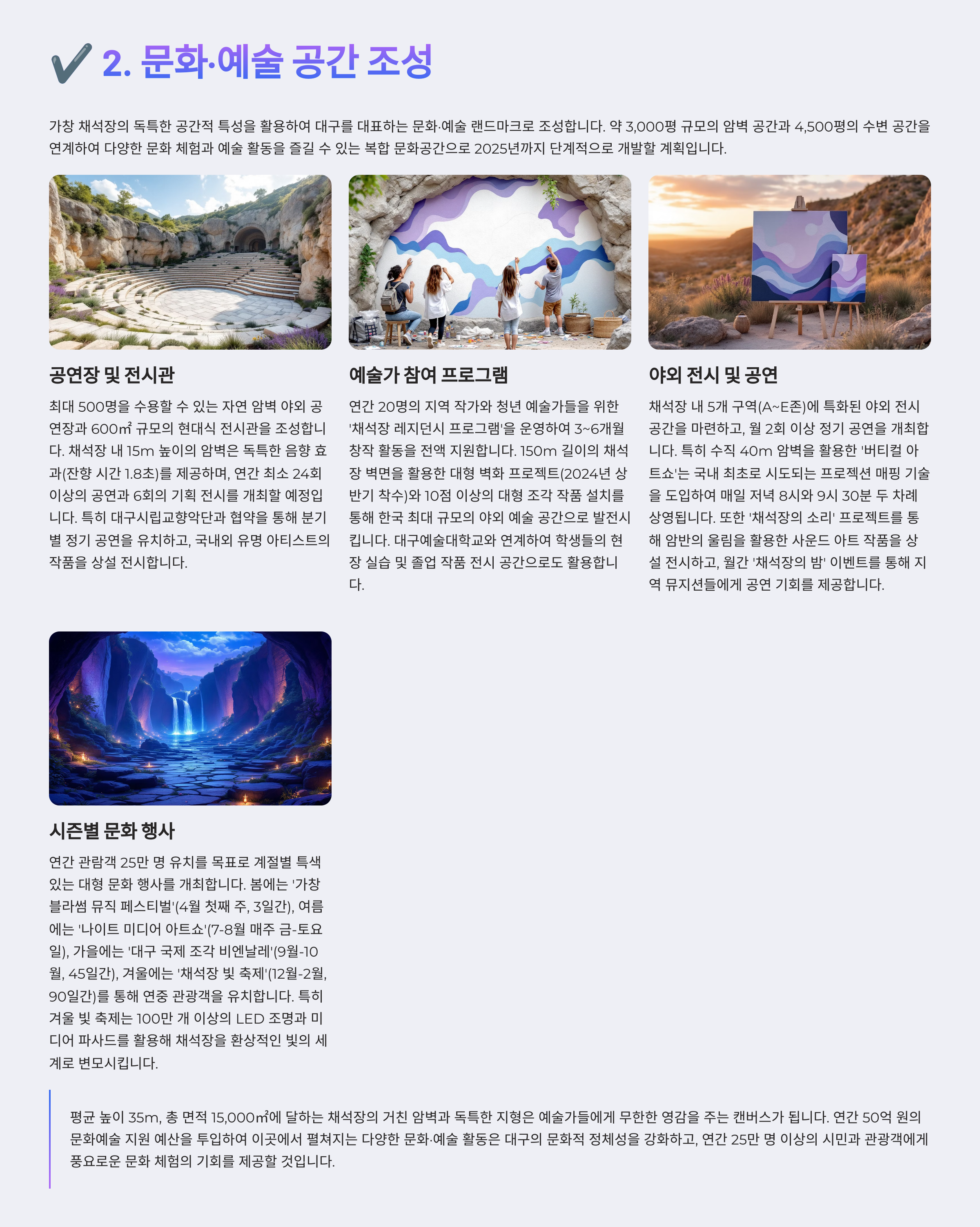 대구시는 가창 채석장을 단순히 관광지로만 만드는 것이 아니라, 문화·예술·경제가 어우러지는 복합 공간으로 개발할 계획입니다.