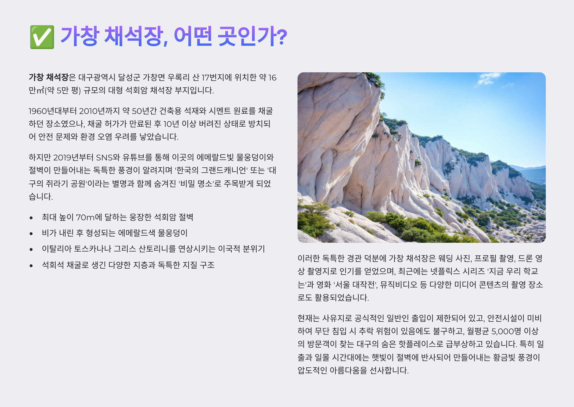 가창 채석장은 기존 자연 지형을 훼손하지 않고도 이국적인 풍경을 제공하는 매우 희소한 장소입니다.