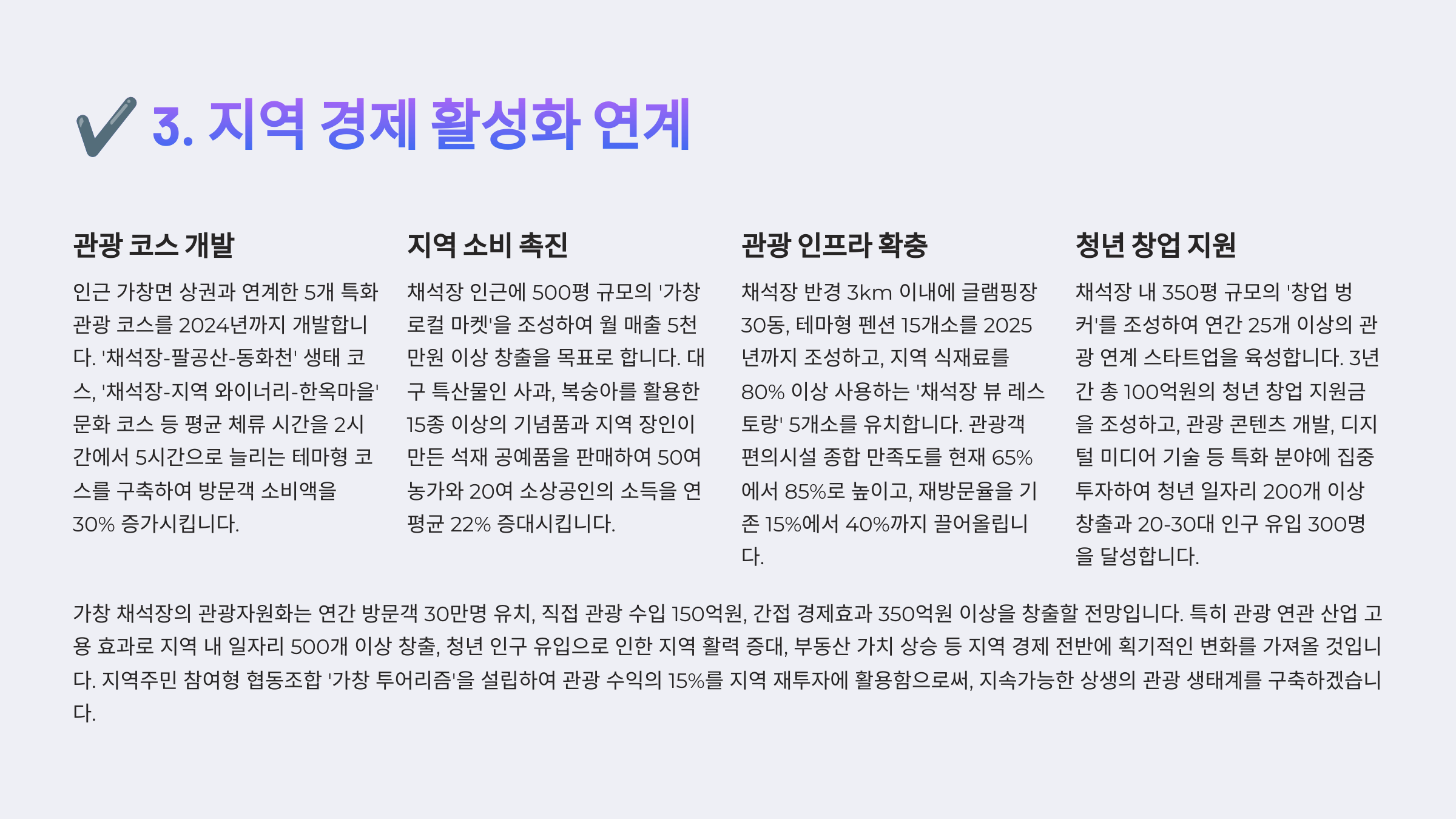 - 관광지 운영, 콘텐츠 제작, 문화 행사 기획 등 새로운 일자리 창출