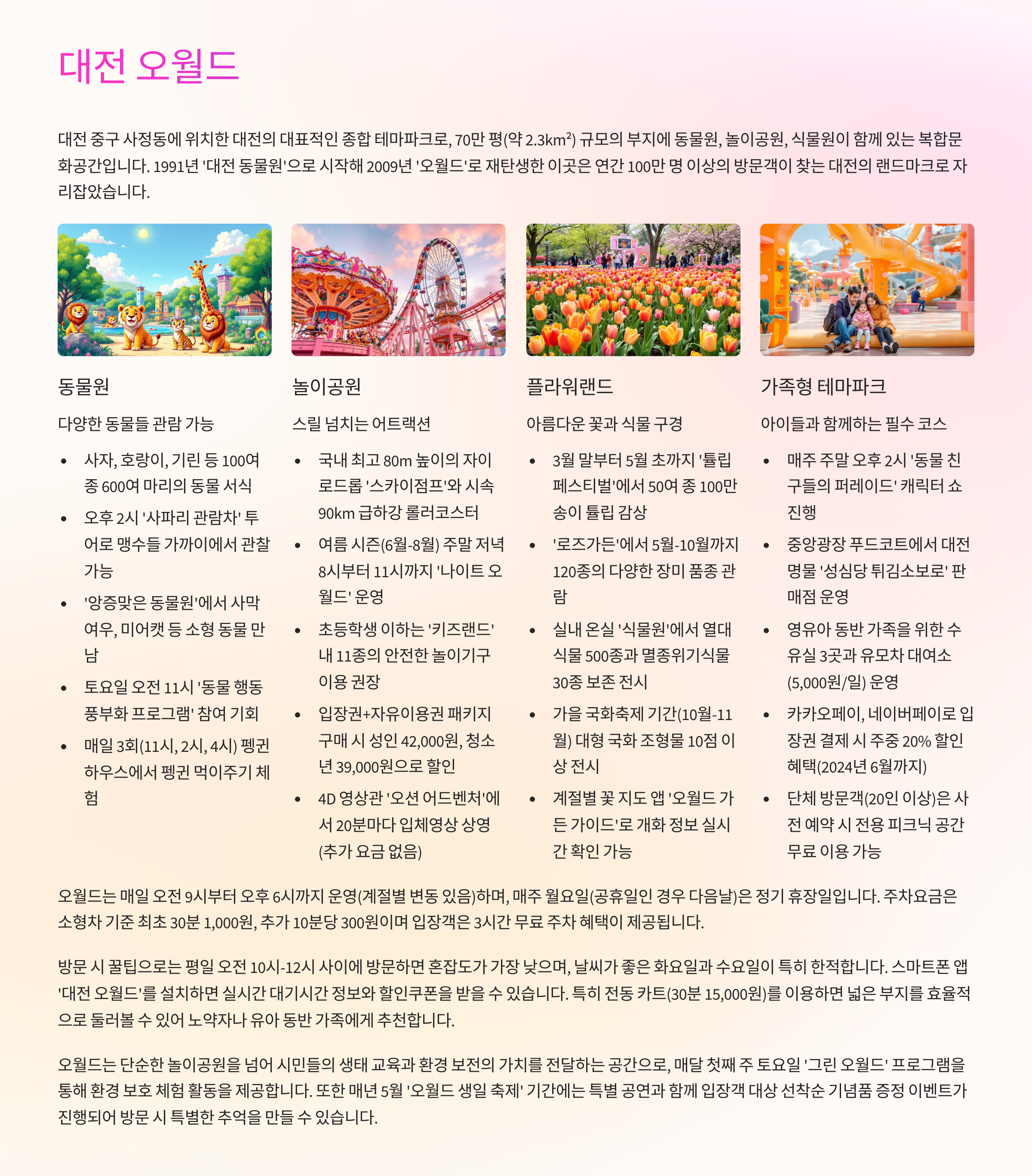 동물원, 놀이공원, 플라워랜드가 한데 어우러진 가족형 테마파크. 아이들과 함께하는 여행이라면 필수 코스입니다.