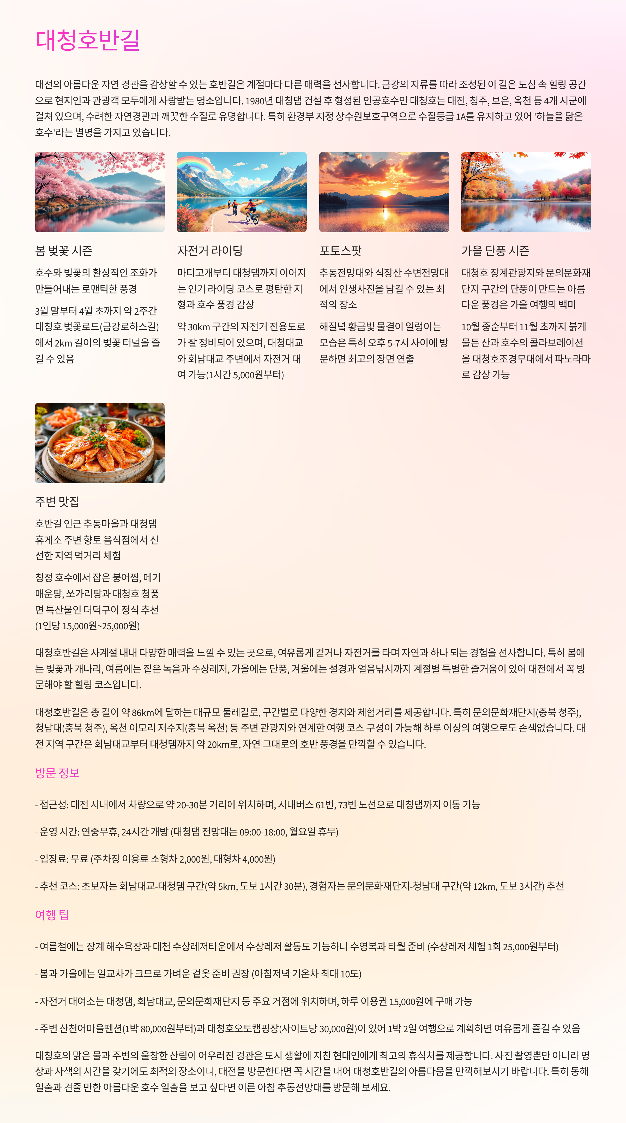 대청호 주변을 따라 걷는 산책로. 특히 가을 단풍 시즌과 봄 벚꽃 시즌에 풍경이 아름답고, 자전거 라이딩 명소로도 유명해요.