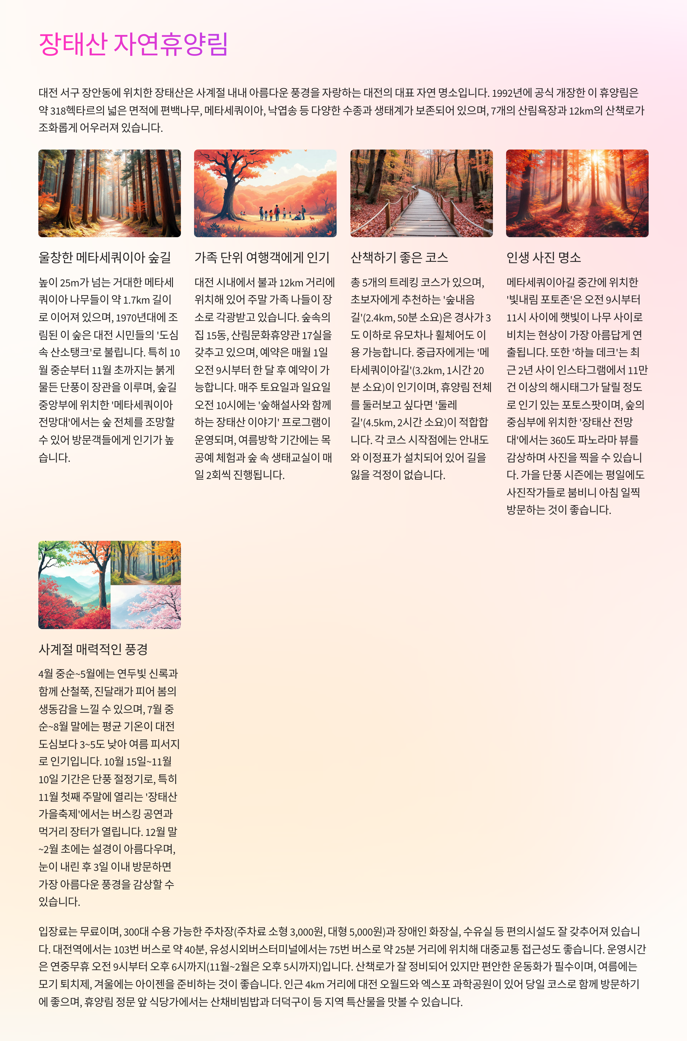 울창한 메타세쿼이아 숲길이 펼쳐진 힐링 명소. 대전 도심에서 가까우면서도 깊은 자연을 느낄 수 있어 가족 단위 여행객에게 인기입니다.