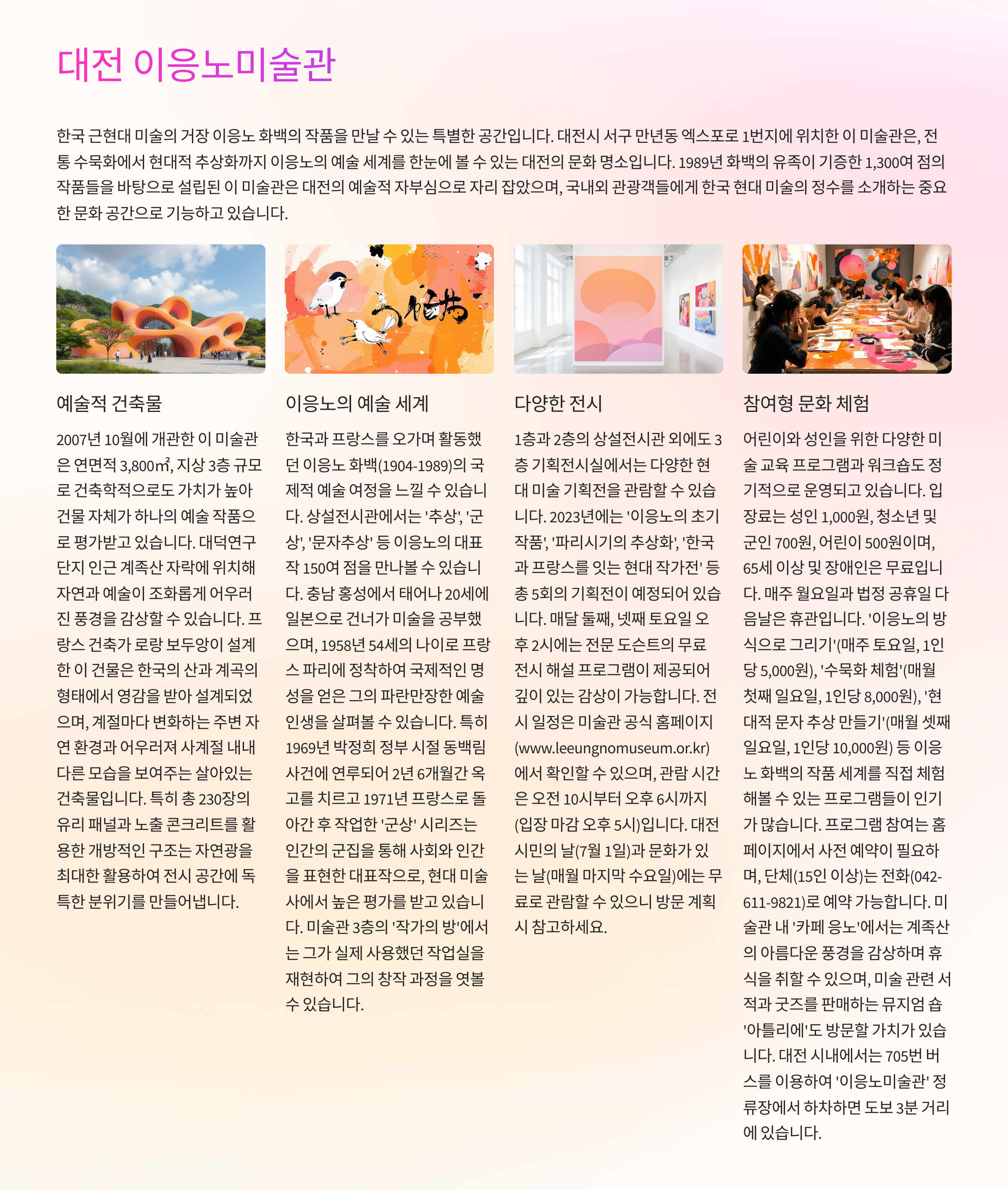 한국 근현대 미술의 거장 이응노 화백의 작품을 만날 수 있는 미술관. 조용히 둘러보며 예술 감성을 채우기에 좋은 장소입니다.