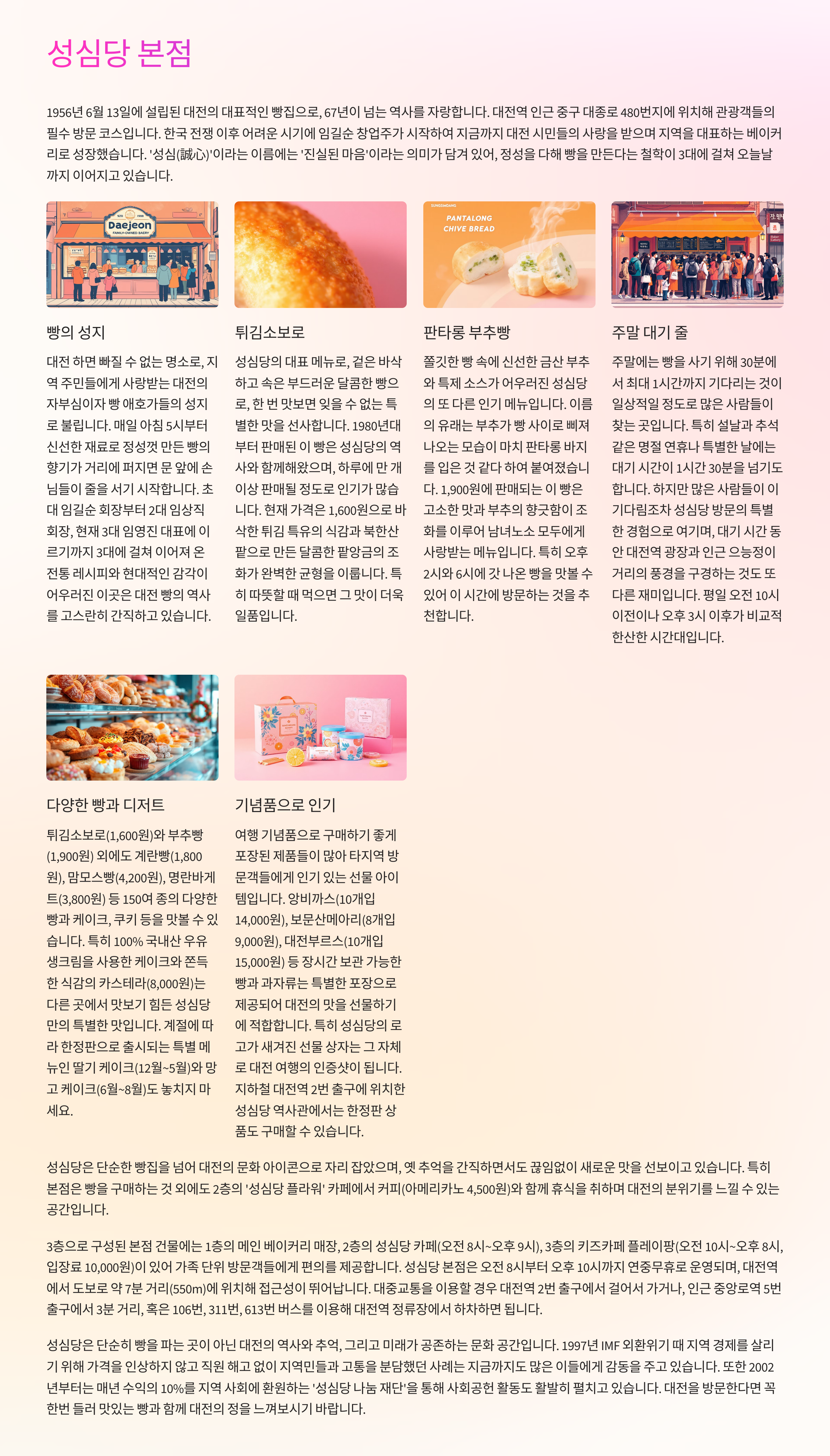 - 빵지순례 필수: 성심당 외에도 테미오래, 빵모양 등 인기 베이커리 많아요.