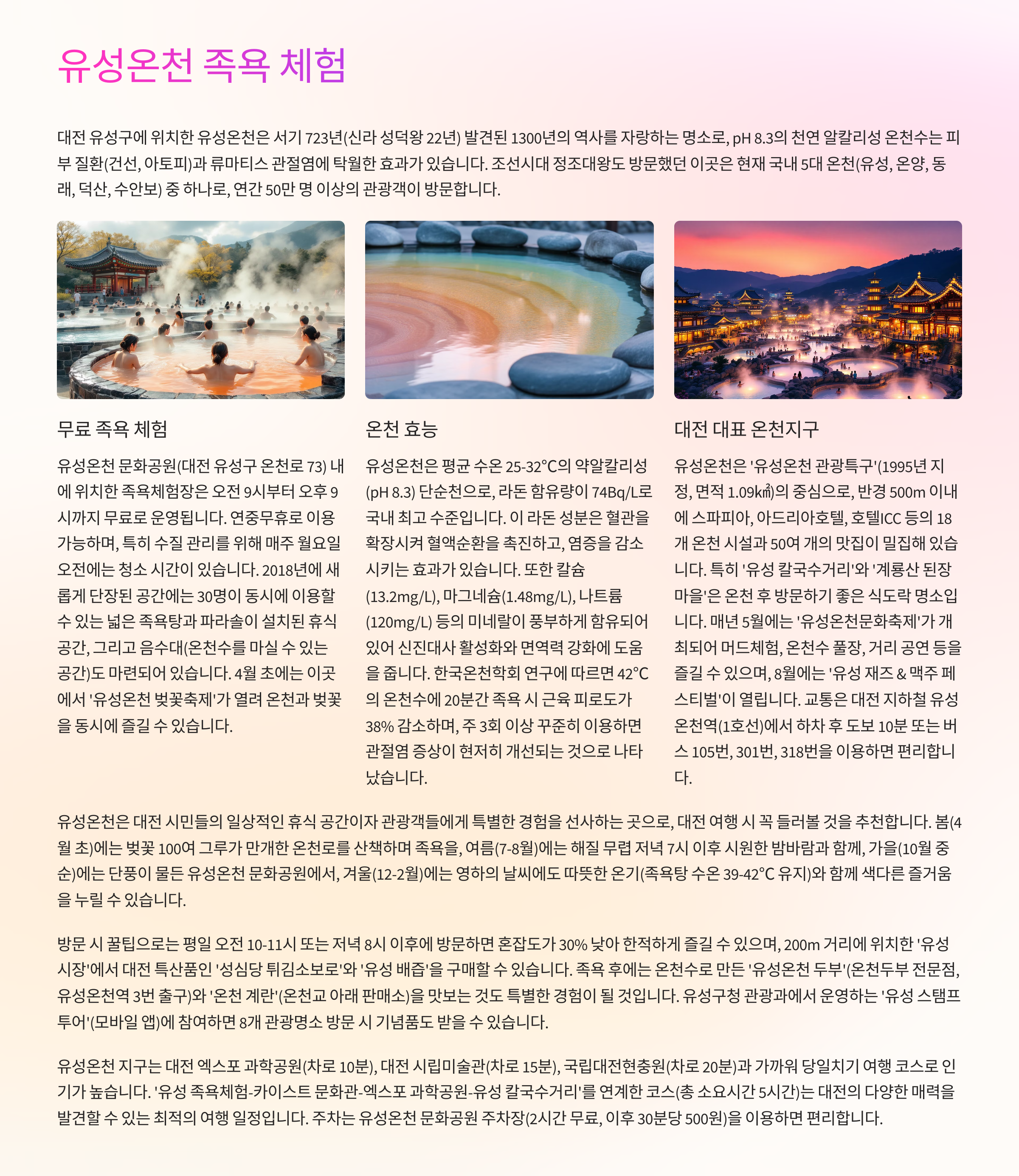 - 1박 2일 코스 추천: 첫날 자연과 온천, 둘째 날 도심 핫플과 미술관을 조합하면 알찬 여행이 됩니다.
