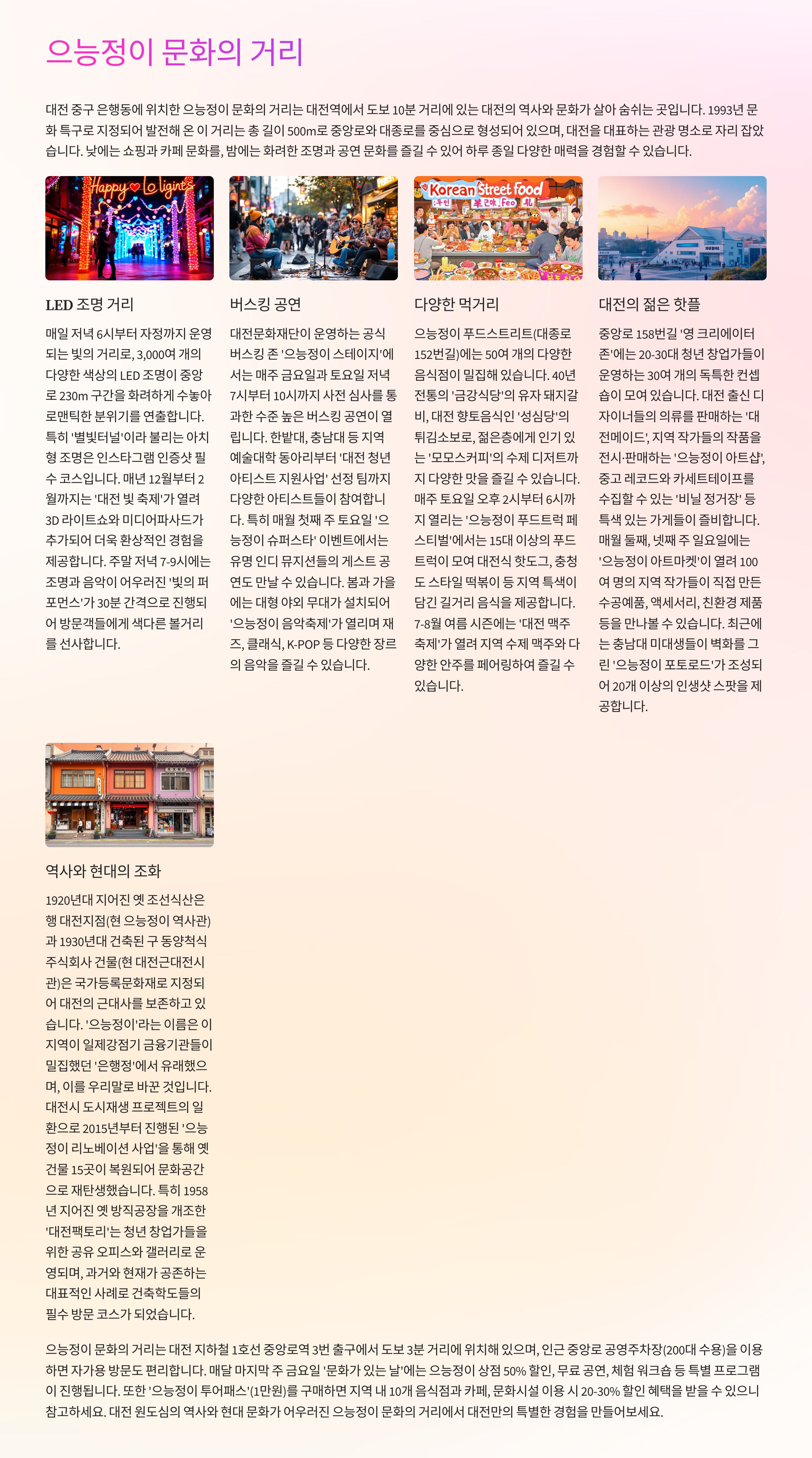 - 맛집 탐방: 두부두루치기, 칼국수, 콩나물국밥 등 대전만의 로컬 맛집도 놓치지 마세요.
