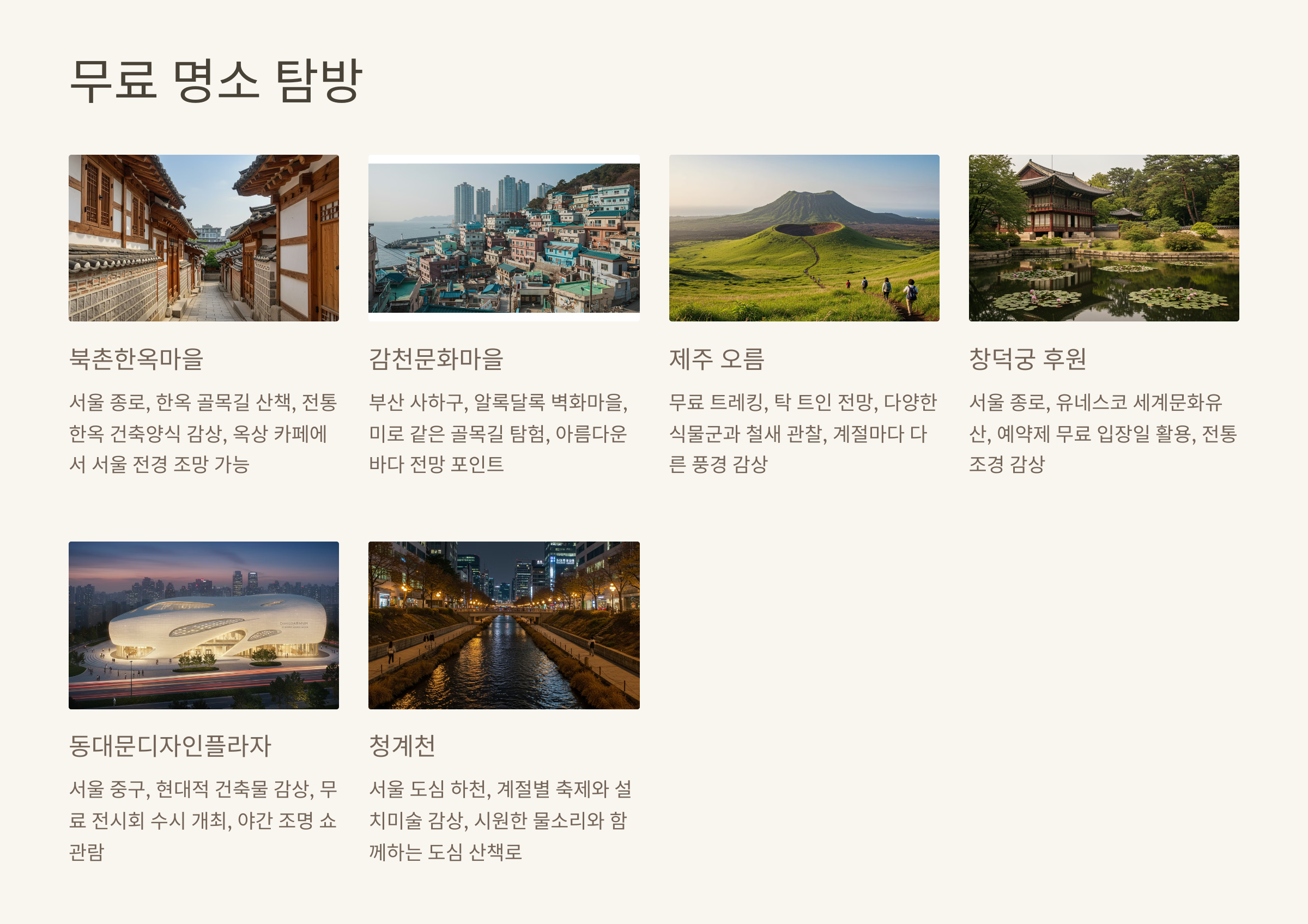 | 제주 오름 | 제주 전역 | 무료 트레킹 코스로 탁 트인 전망 제공 |