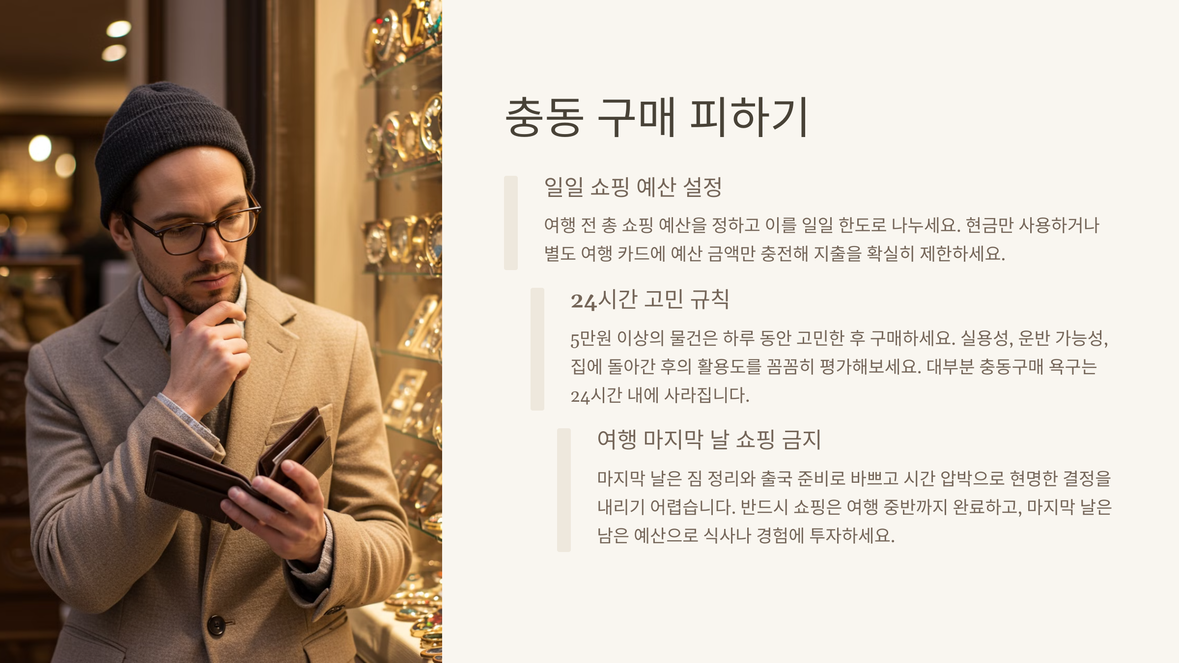 - 여행 마지막 날 쇼핑 금지! 충동 구매를 줄이기 위한 팁