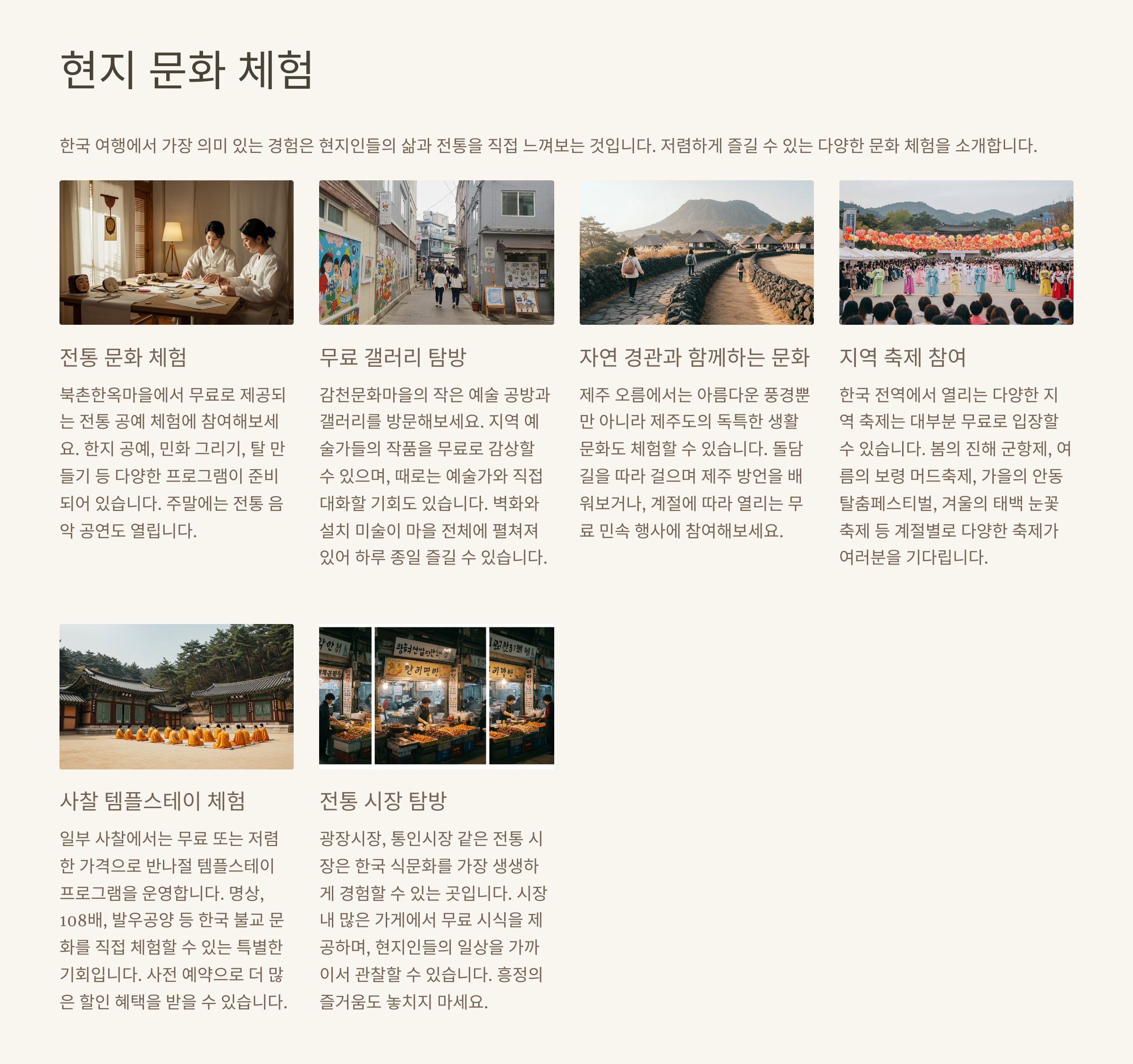 | 서울 북촌한옥마을 | 서울 종로 | 한옥 골목길 산책과 전통 문화 체험 가능 |