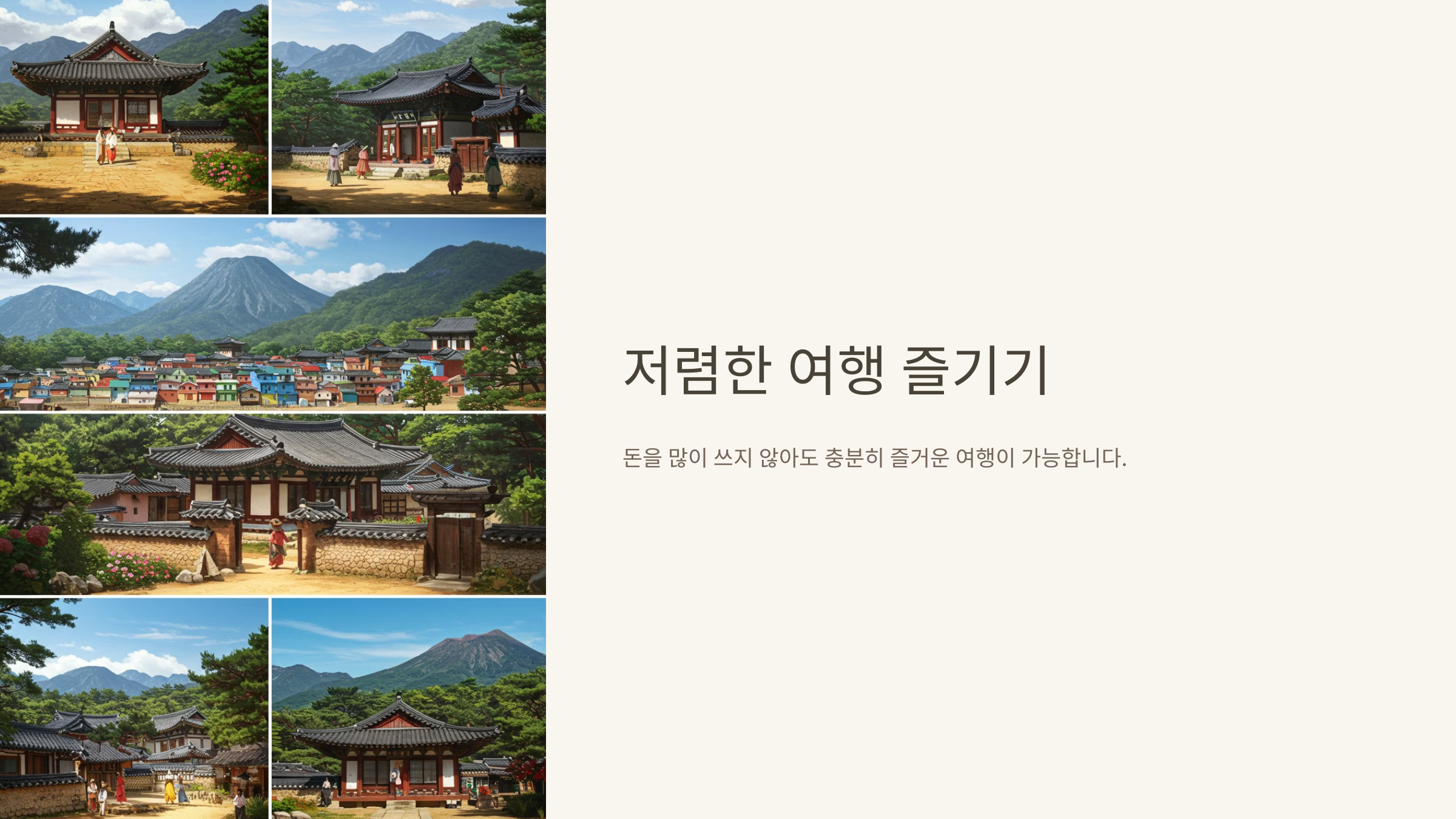 돈을 많이 쓰지 않아도 충분히 즐거운 여행이 가능합니다. 전국 곳곳에 무료로 개방된 명소나 저렴하게 즐길 수 있는 액티비티가 많아요!
