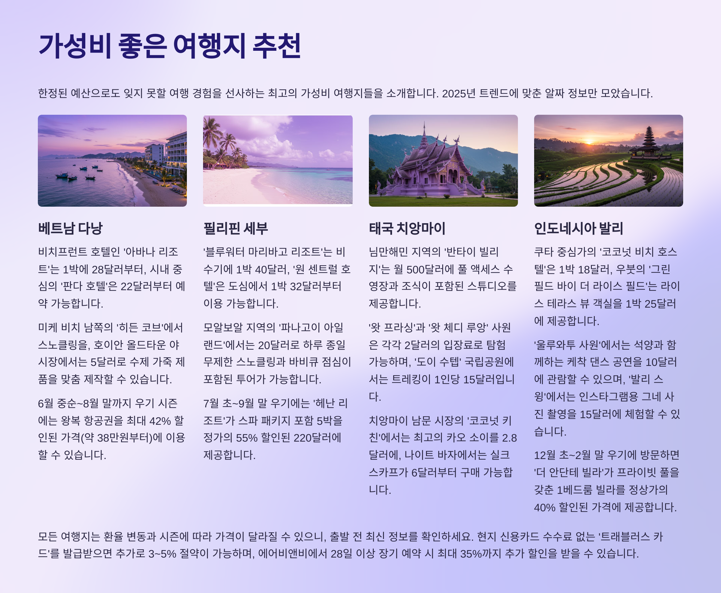 2025년에 가성비 좋은 여행지로는 베트남 다낭과 필리핀 세부가 있습니다. 숙소와 음식 가격이 저렴하면서도 멋진 해변을 즐길 수 있어요.