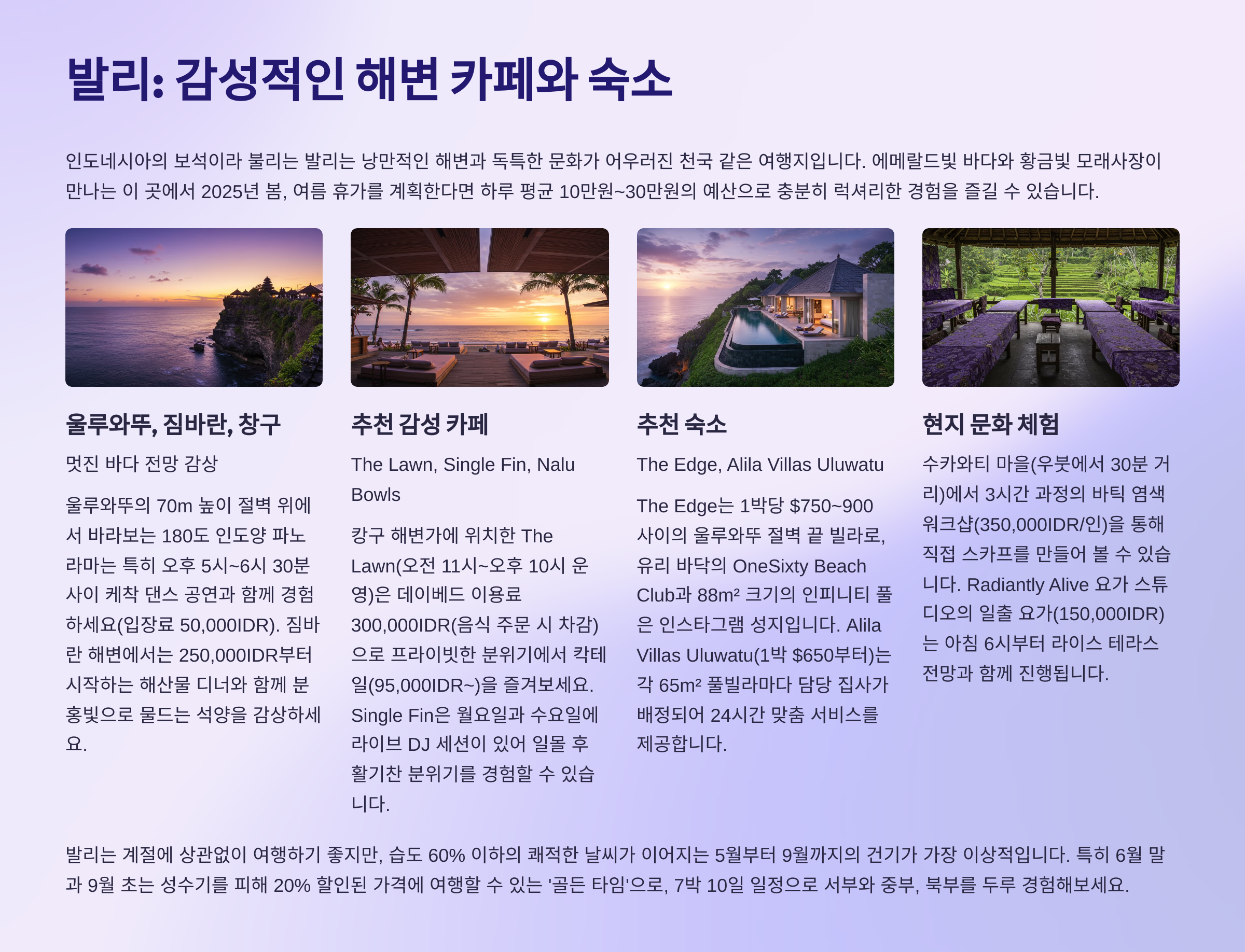 발리는 아름다운 해변과 감성적인 카페, 그리고 자연 속에서 힐링할 수 있는 숙소로 유명한 여행지입니다. 특히 울루와뚜, 짐바란, 그리고 창구 지역에서는 멋진 바다 전망을 감상하며 여유로운 시간을 보낼 수 있습니다.