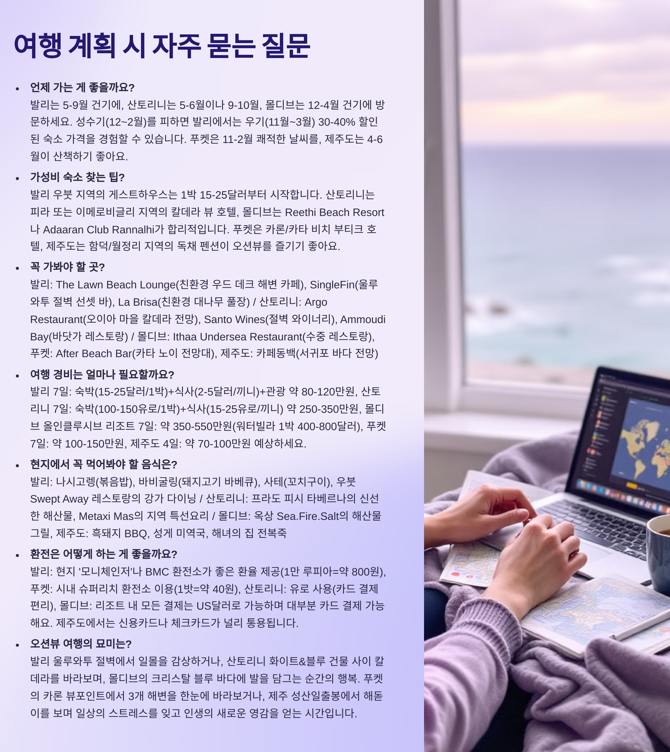 여행은 단순한 휴식이 아니라, 삶을 더욱 풍요롭게 만들어주는 특별한 경험이죠. 이번 글에서는 2025년에 꼭 가봐야 할 바다 전망이 아름다운 여행지를 소개해드렸어요. 발리의 감성적인 카페, 산토리니의 로맨틱한 레스토랑, 몰디브의 럭셔리 리조트, 푸켓과 제주도의 숨겨진 명소까지! 어떤 곳이든, 나에게 가장 잘 맞는 여행지를 선택하는 것이 중요합니다. 💜