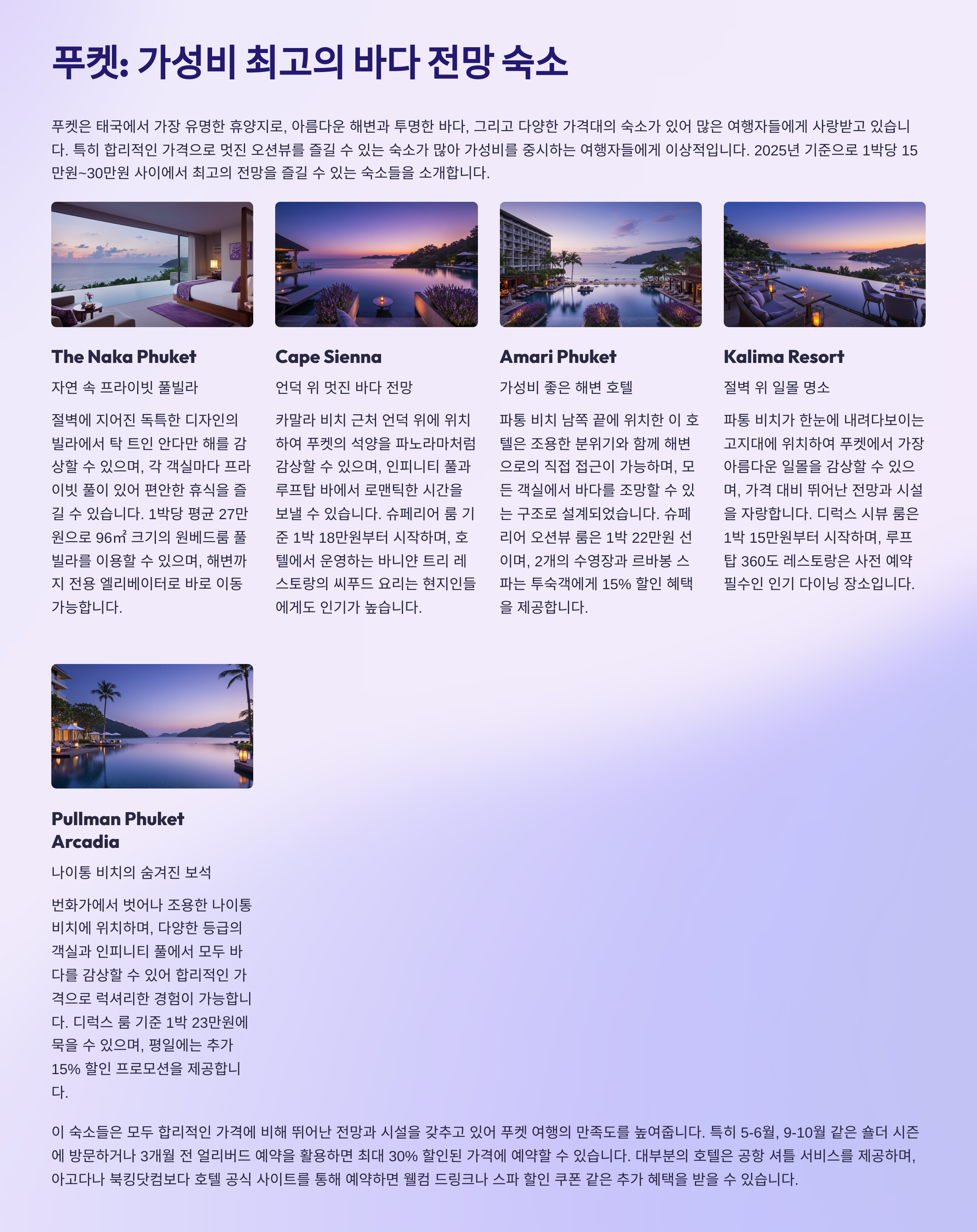 태국 푸켓은 상대적으로 저렴한 비용으로도 훌륭한 오션뷰 숙소를 찾을 수 있는 곳입니다. 저렴하면서도 럭셔리한 분위기를 갖춘 호텔들을 소개합니다.