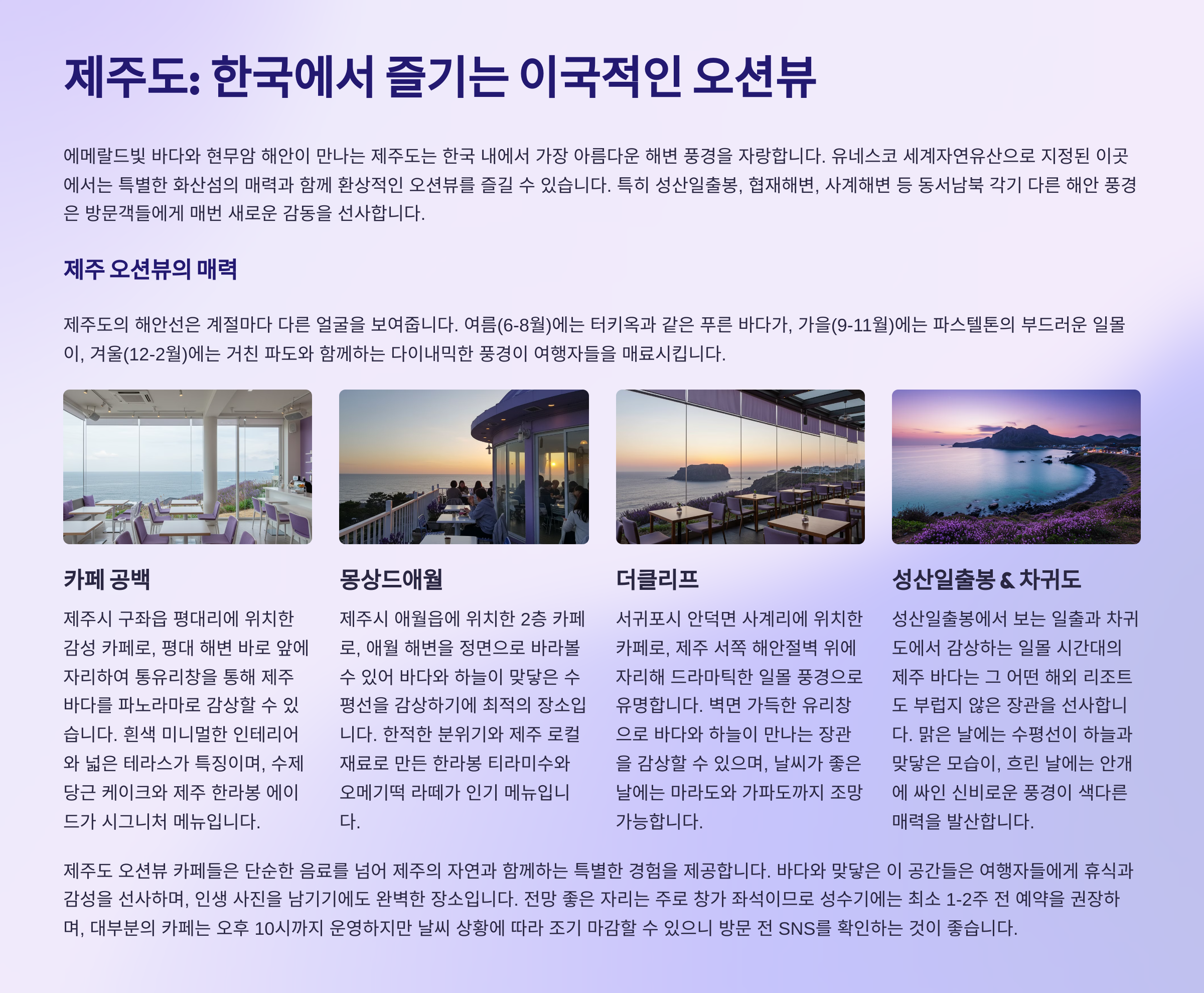 한국에서도 해외 못지않은 아름다운 해변을 즐길 수 있는 곳이 바로 제주도입니다. 감성적인 카페와 숙소, 그리고 바다 전망을 한눈에 볼 수 있는 명소를 소개합니다.