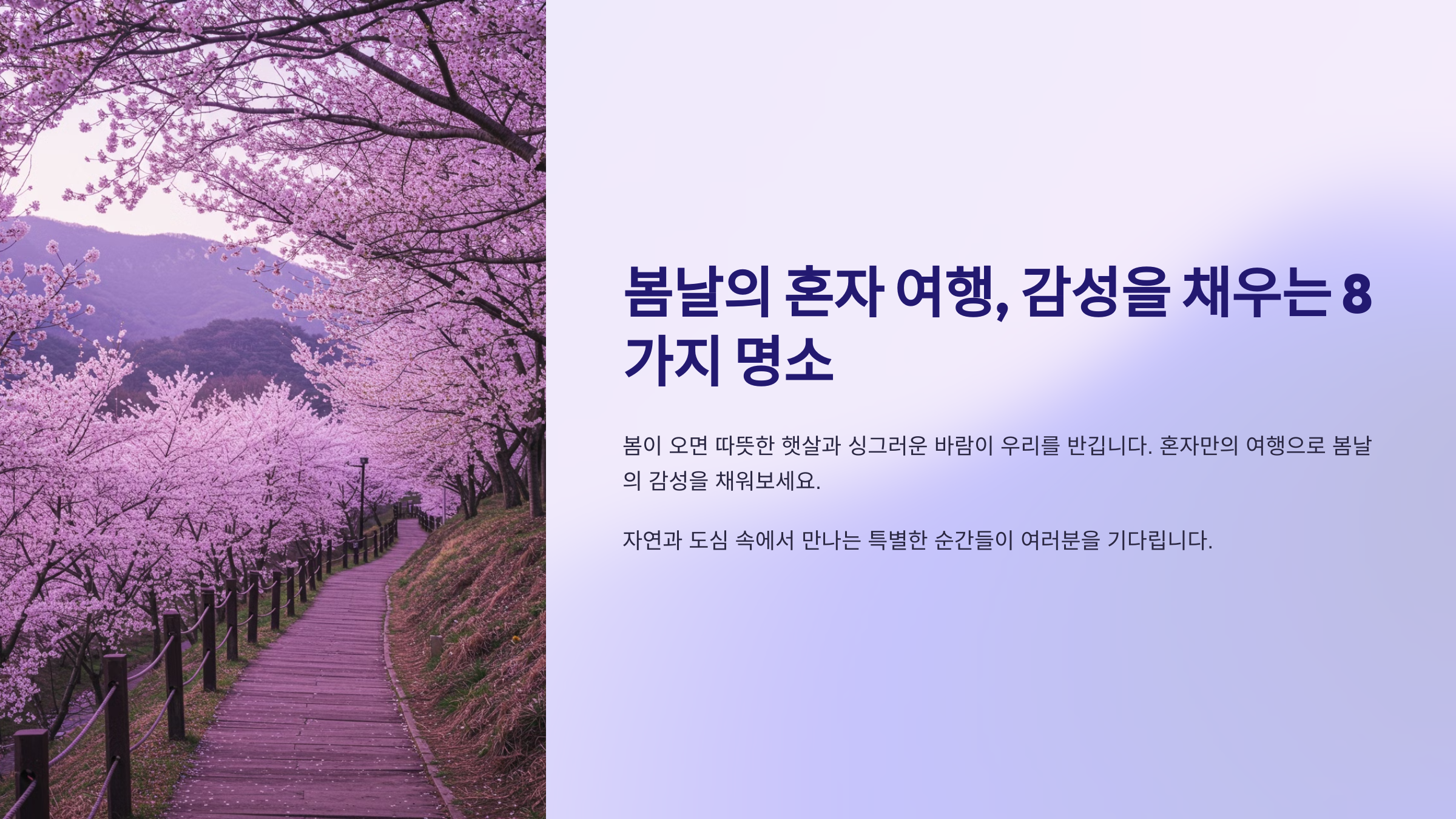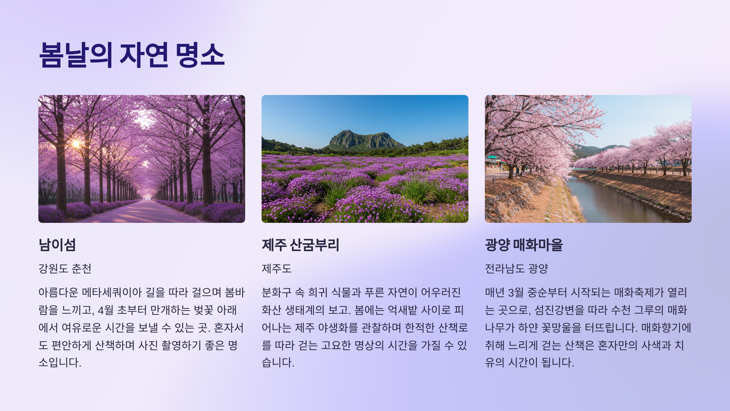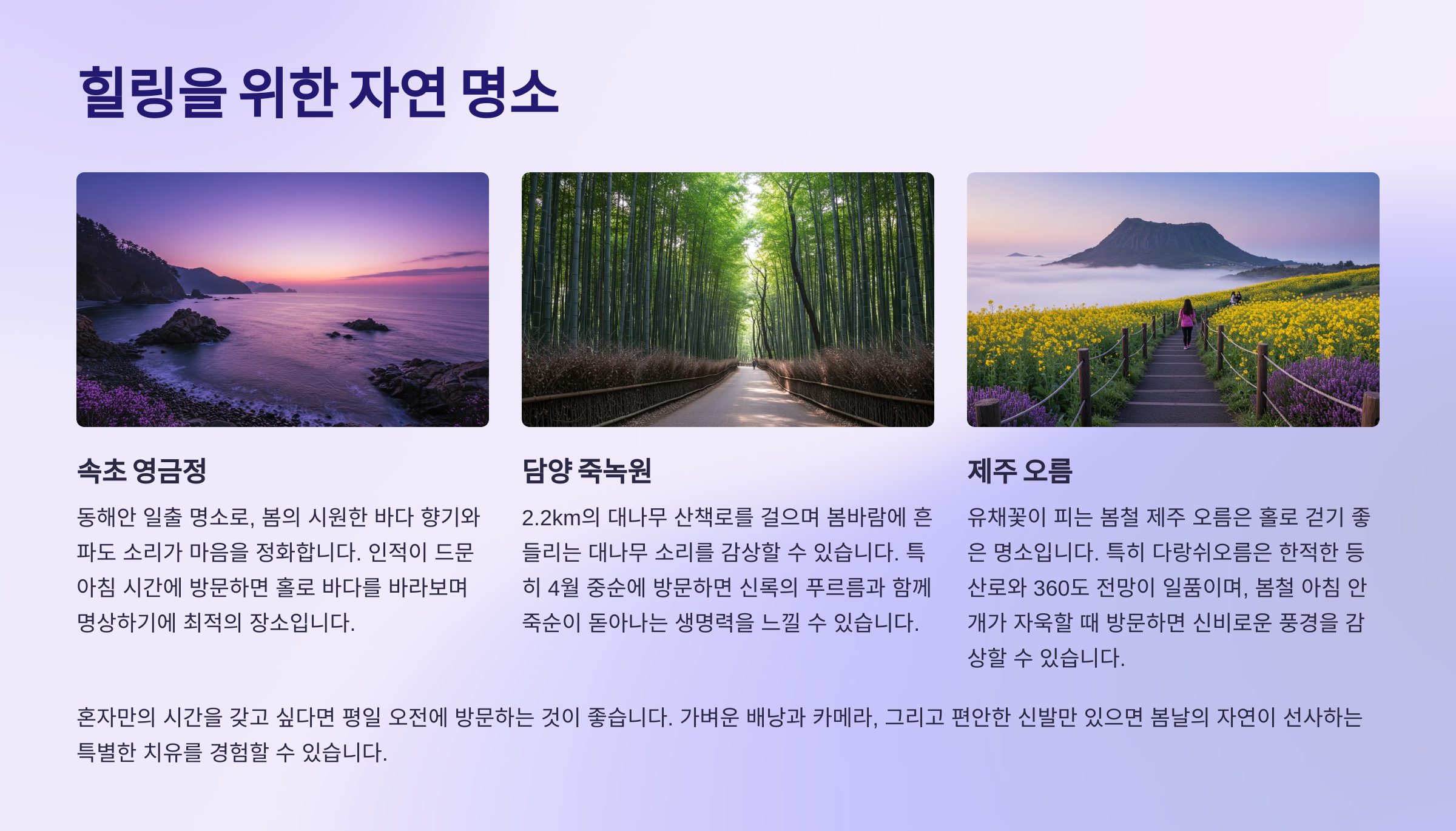 봄이 오면 자연 속에서 따뜻한 햇살과 싱그러운 바람을 만끽하는 게 최고의 힐링이죠. 혼자서도 충분히 즐길 수 있는 자연 명소 몇 곳을 소개해 드릴게요.