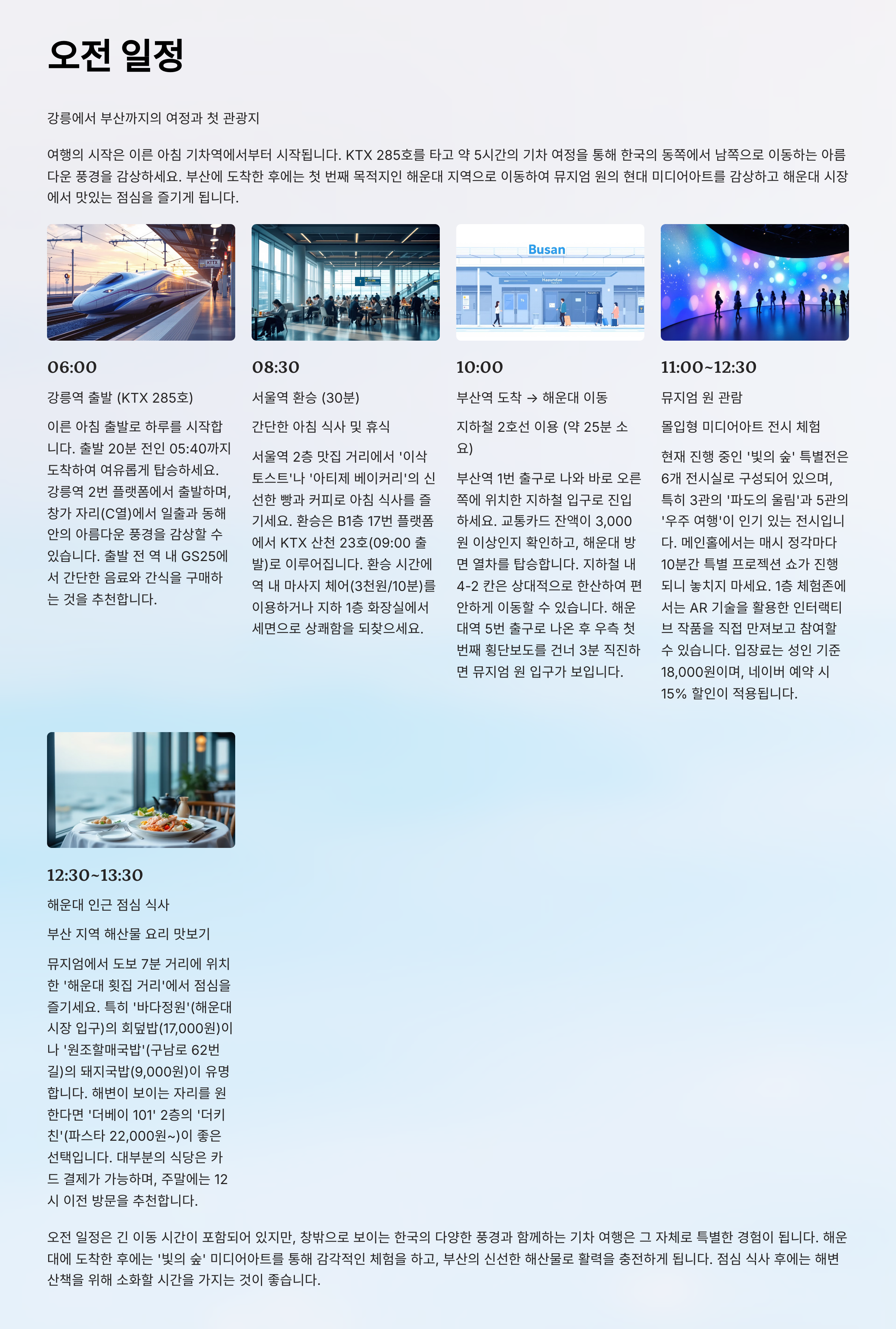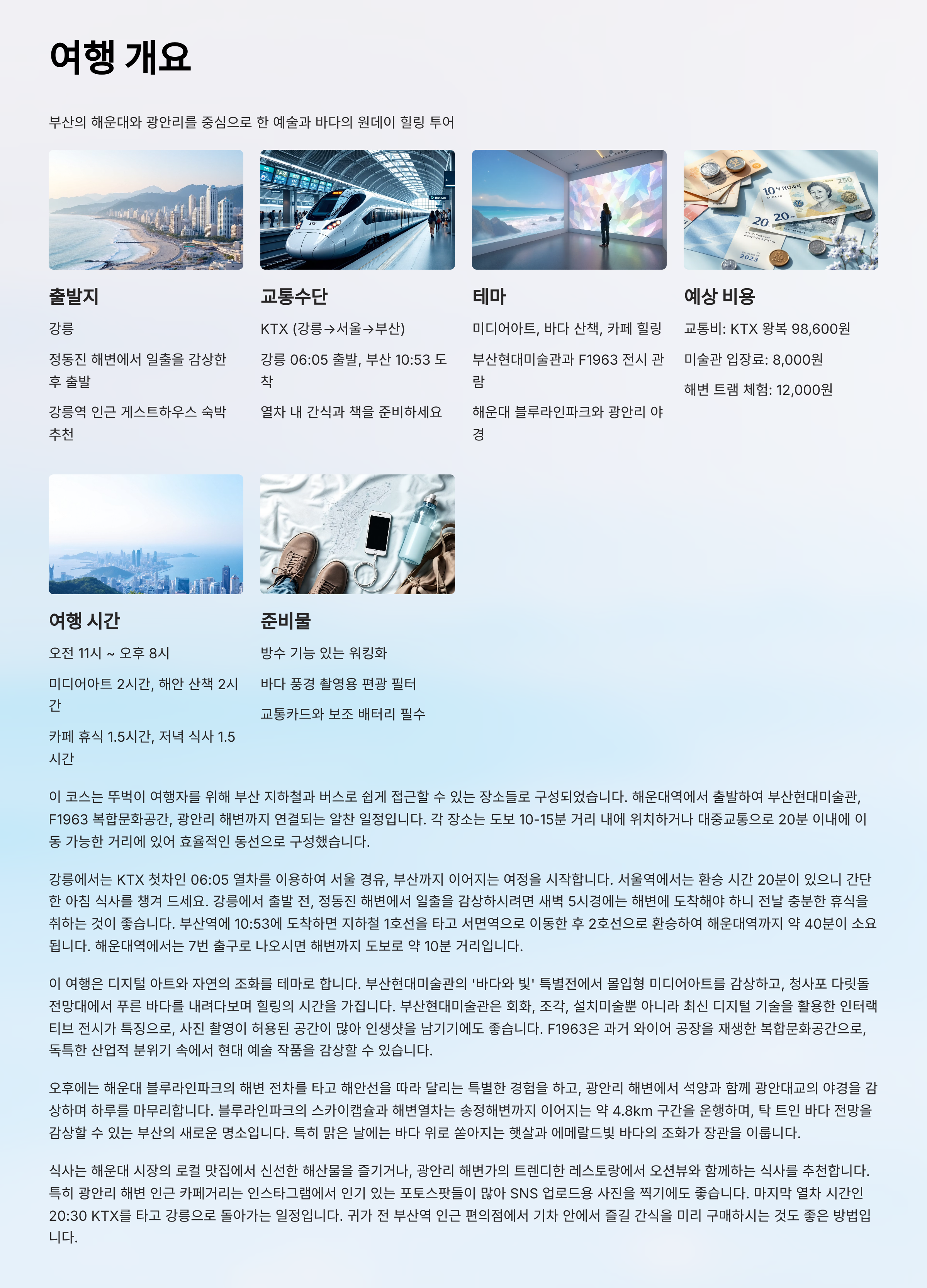 - 교통수단: KTX (강릉 → 서울 → 부산)