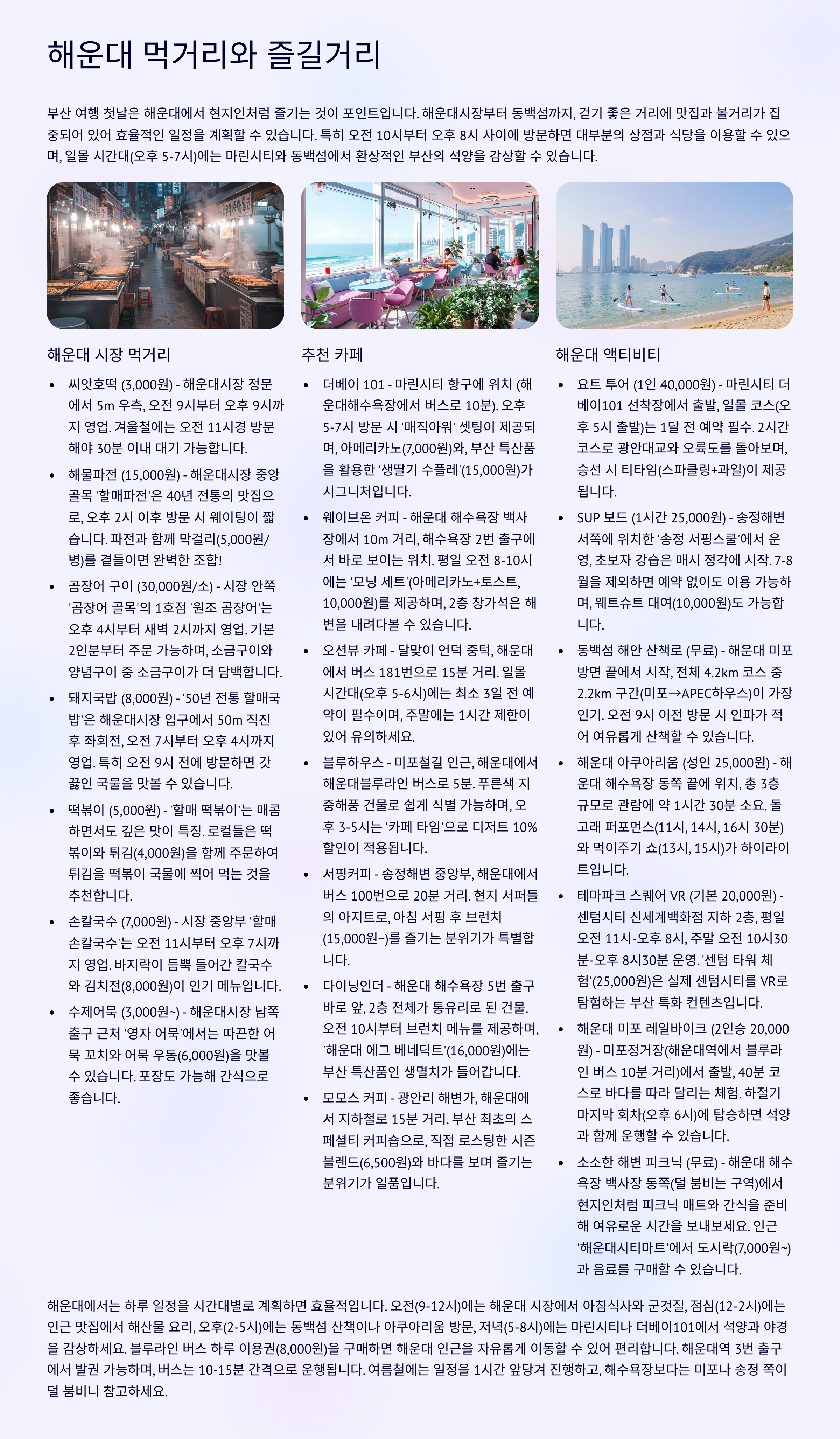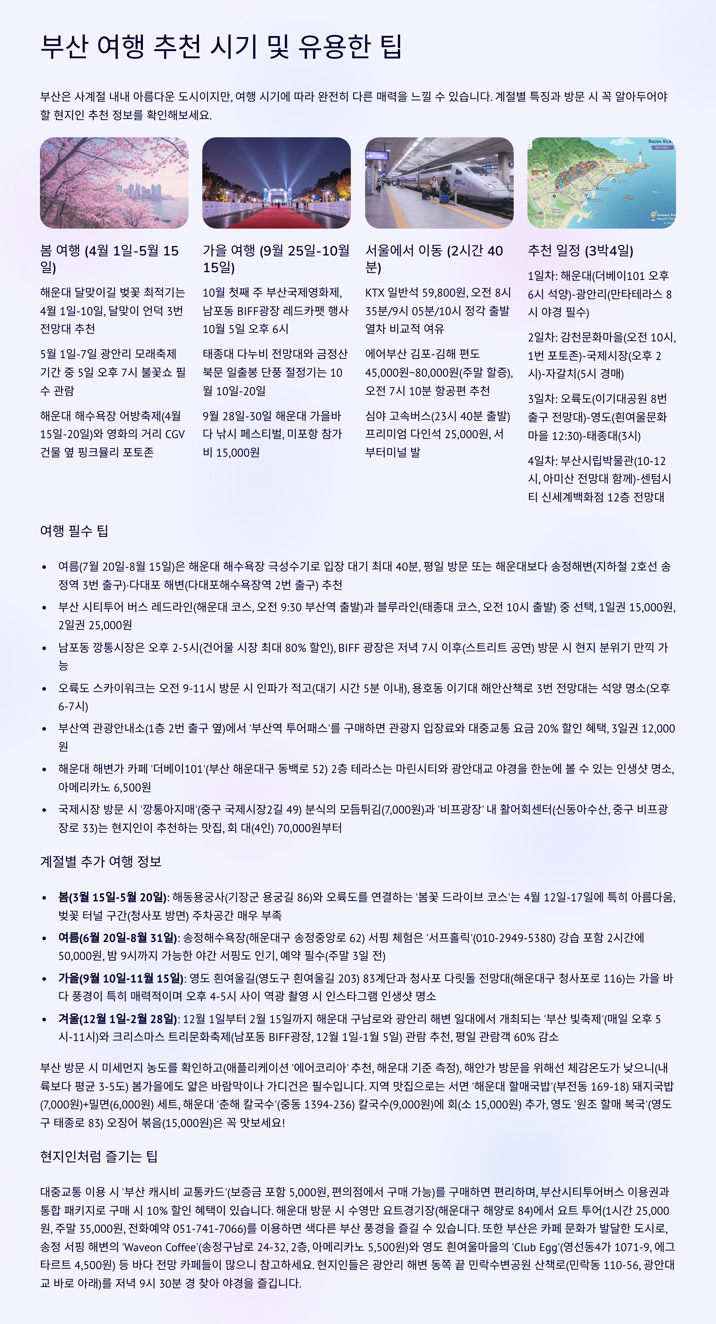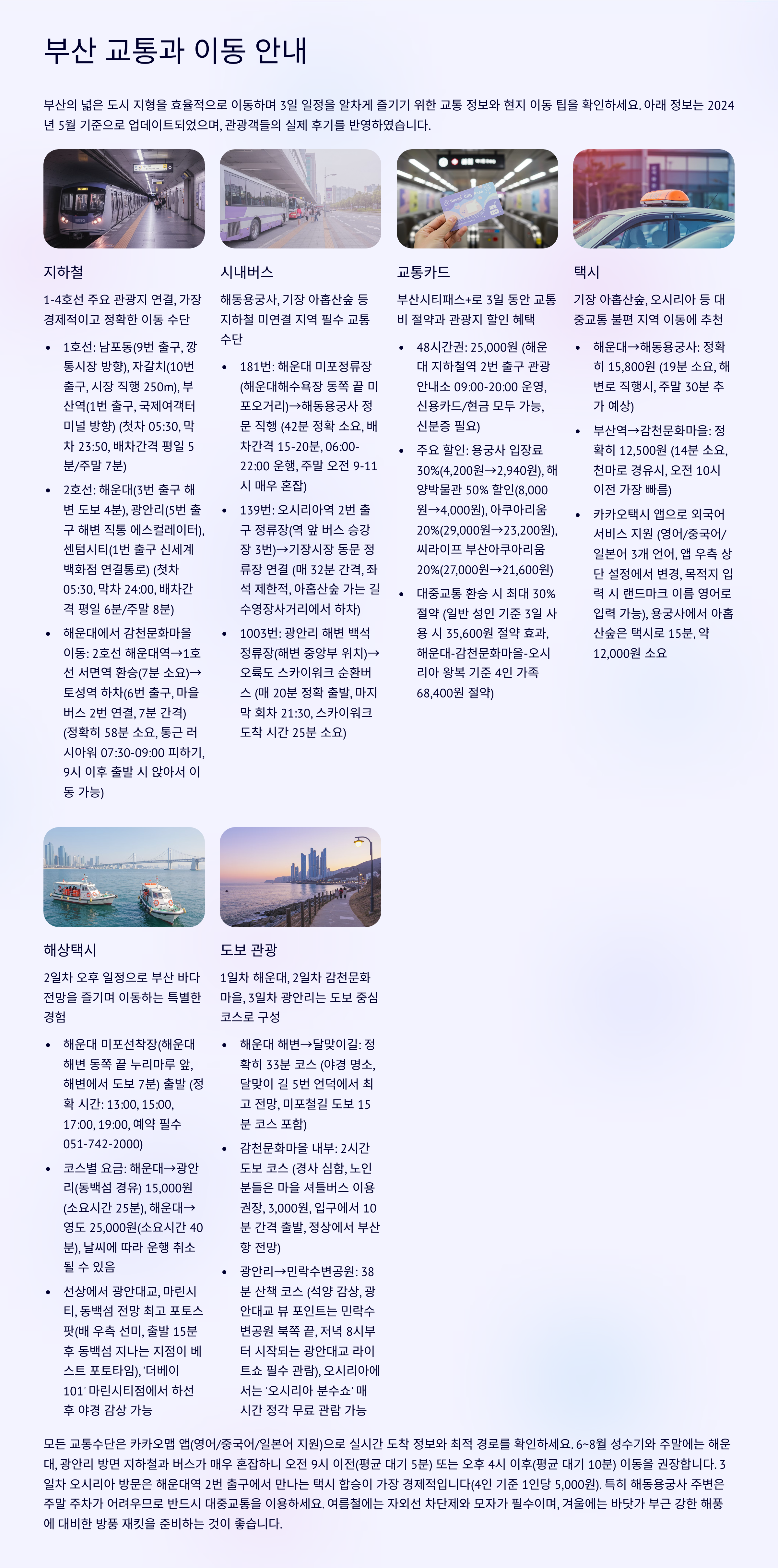 - 교통패스: 부산시티패스 또는 교통카드 사용 추천 합니다