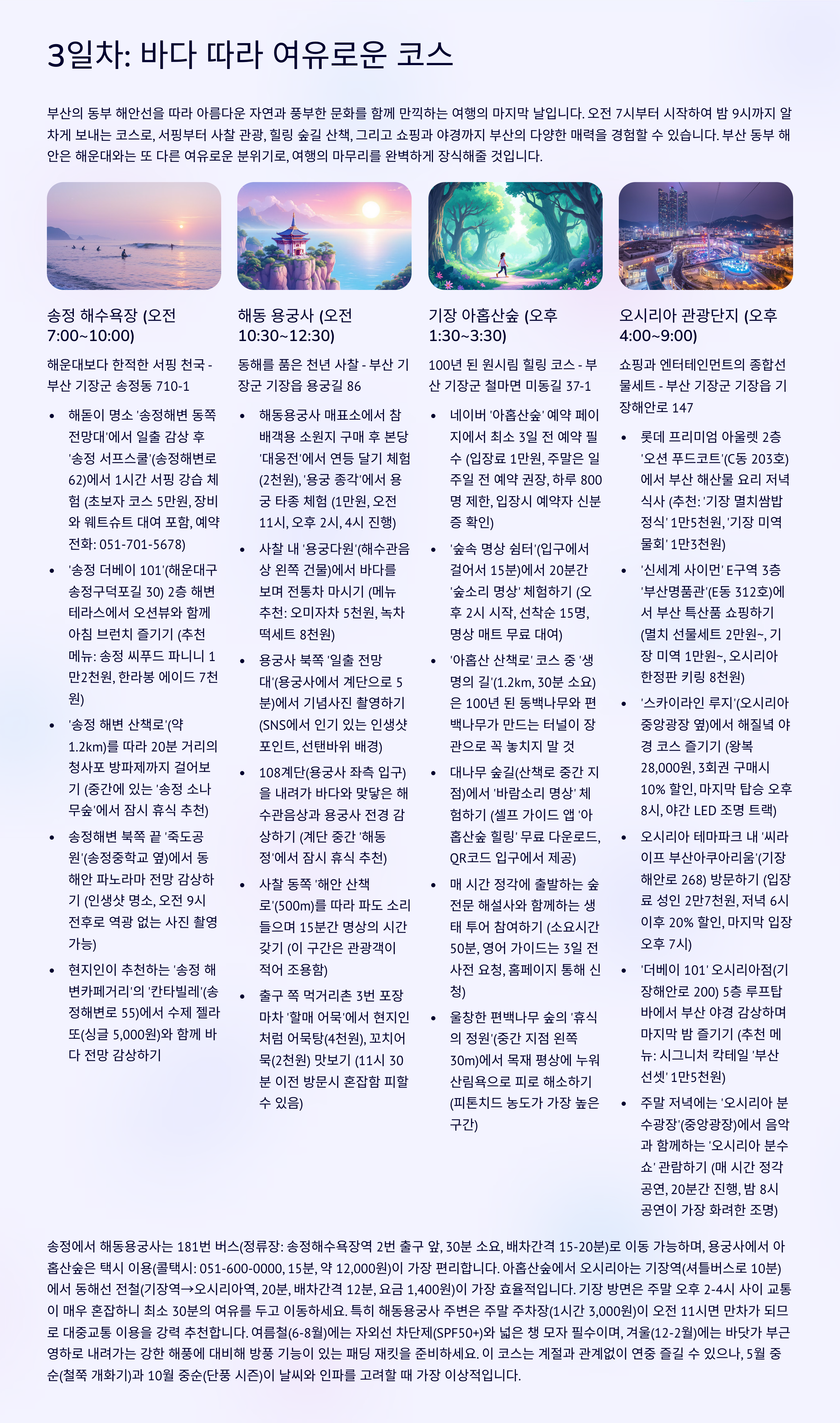 여행 마지막 날은 부산 동쪽을 중심으로 한 자연 치유 코스를 추천합니다. 송정 해수욕장은 조용한 분위기로 산책하기 좋고, 해동 용궁사는 바다 절벽 위에 자리해 아름다운 절경을 자랑합니다. 기장 아홉산숲에서는 힐링 산책을, 오시리아 관광단지에서는 쇼핑과 맛집 투어로 여행을 마무리하세요.
