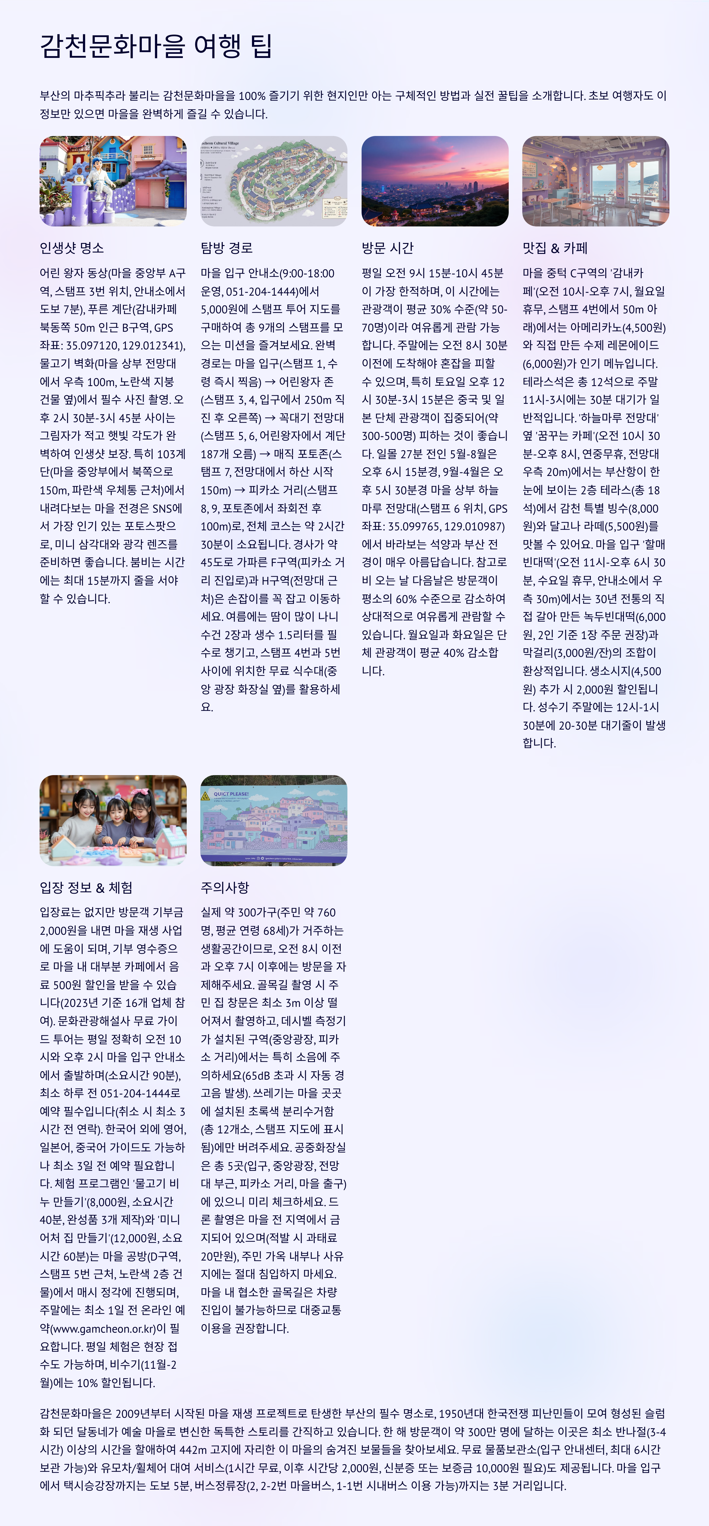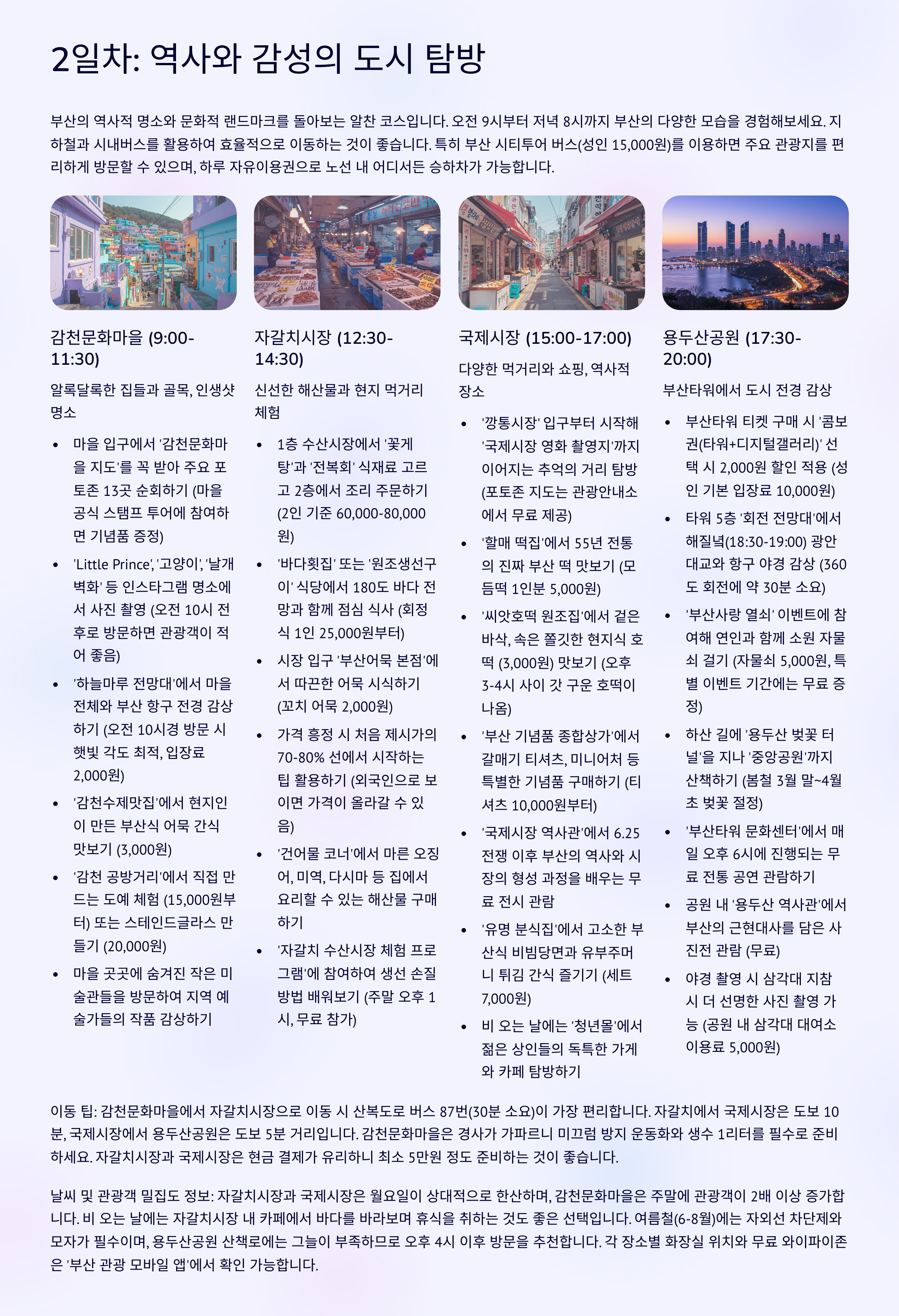 부산의 과거와 현재가 공존하는 지역들을 둘러보는 날입니다. 감천문화마을은 알록달록한 집들과 골목들이 인상적인 곳으로, 인생샷 명소로 유명하죠. 자갈치시장과 국제시장에서는 싱싱한 해산물과 다양한 먹거리를 경험할 수 있습니다. 보수동 책방골목과 용두산공원은 오래된 부산의 감성을 느끼기 좋은 코스입니다.