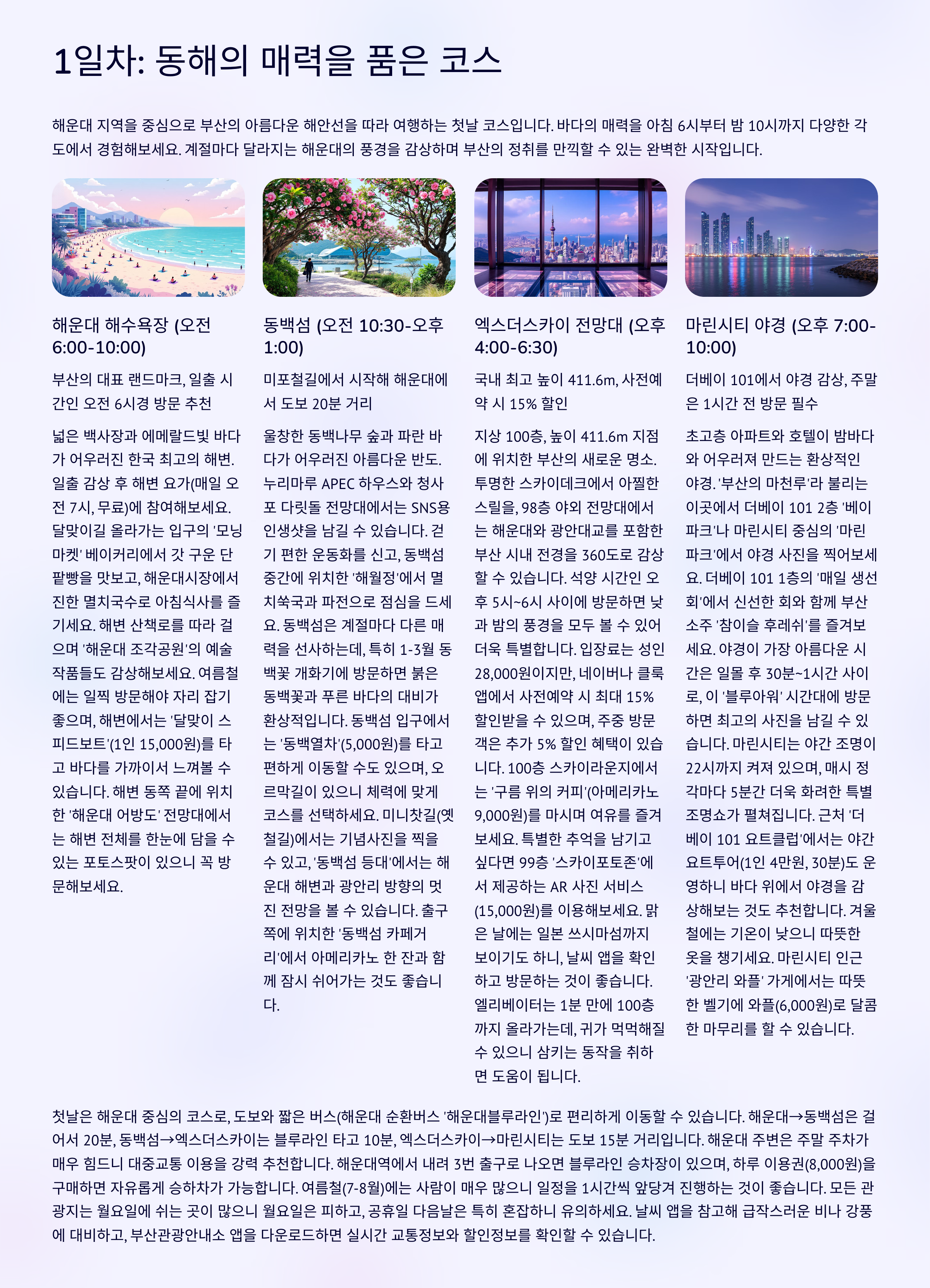 첫날은 부산의 대표 랜드마크인 해운대 해수욕장에서 시작합니다. 새벽 일찍 도착한다면 해돋이를 감상할 수 있으며, 근처 동백섬은 도보로 산책하기 좋은 코스입니다. 엑스 더스카이 전망대는 국내 최고 높이를 자랑하며, 해운대 전경을 한눈에 감상할 수 있습니다. 이후 해운대 시장에서 현지 먹거리 투어, 저녁에는 마린시티에서 감성 가득한 야경을 즐겨보세요.