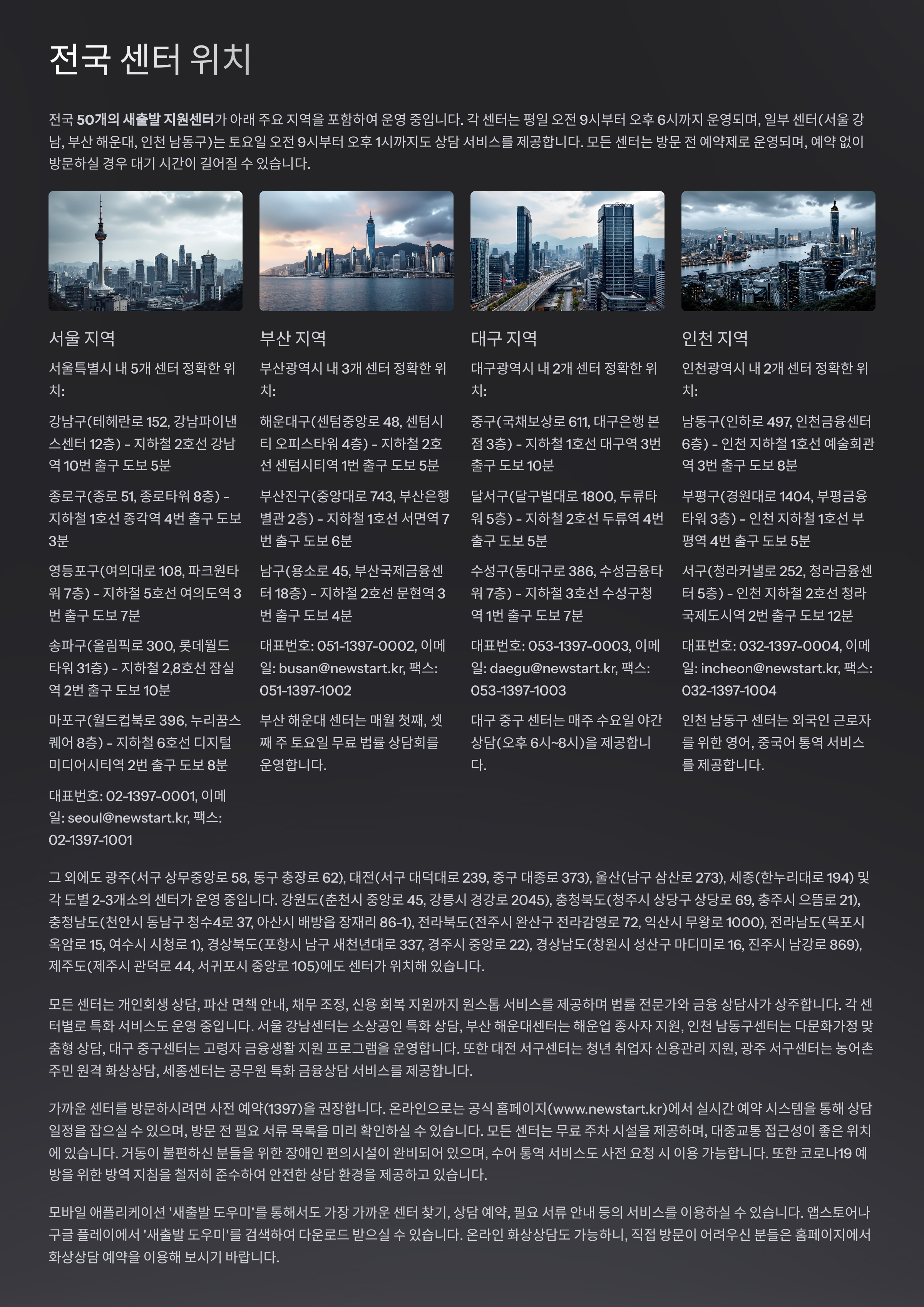 현재 전국에 약 50개의 새 출발 지원센터가 운영 중이며, 직접 방문 상담 또는 전화·온라인 신청도 가능합니다.