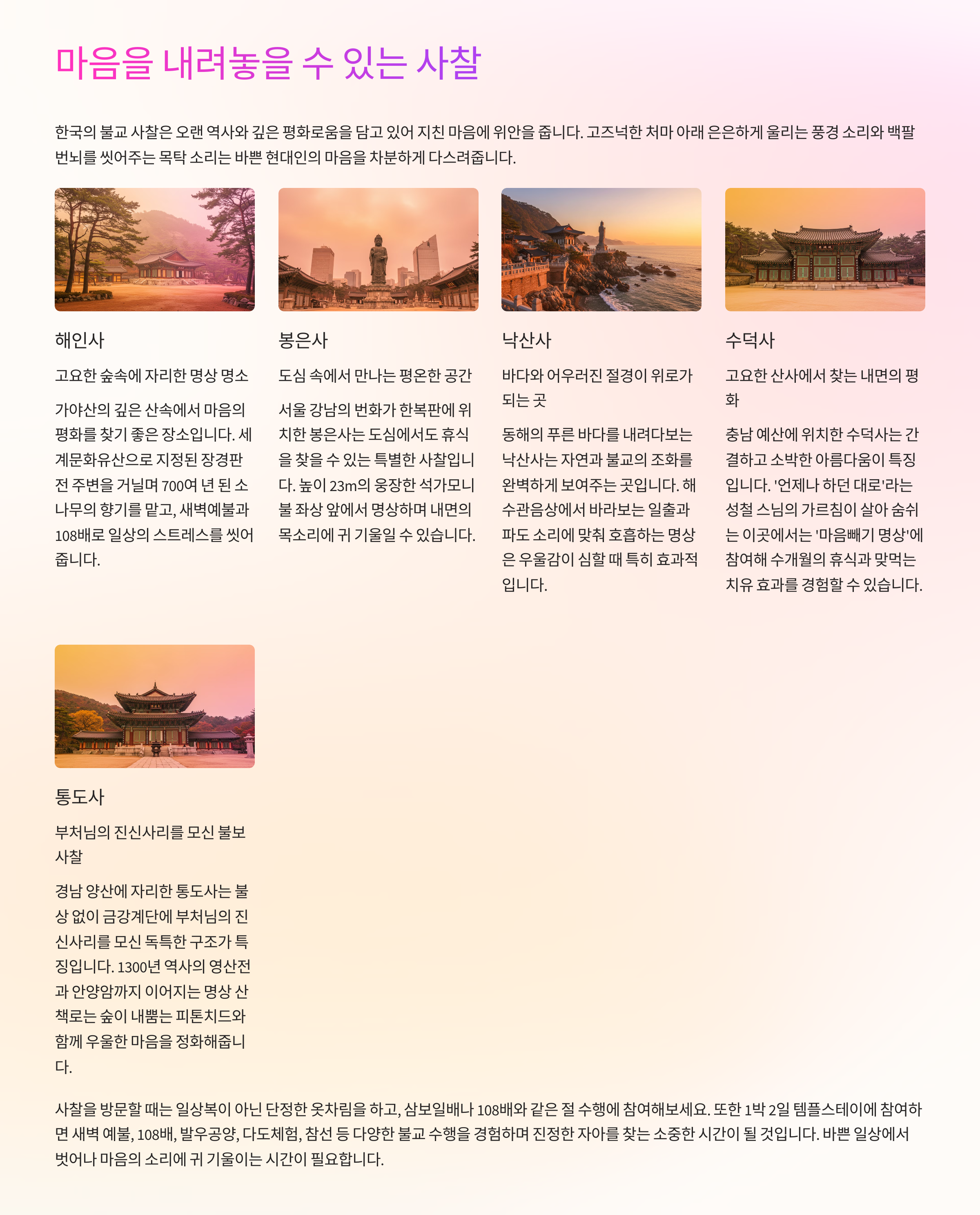 고즈넉한 산사에서 들리는 새소리, 바람에 흔들리는 대나무 소리, 은은한 향 내음. 사찰은 번잡한 생각을 정리하고 내면의 평화를 찾기에 최적의 공간입니다.