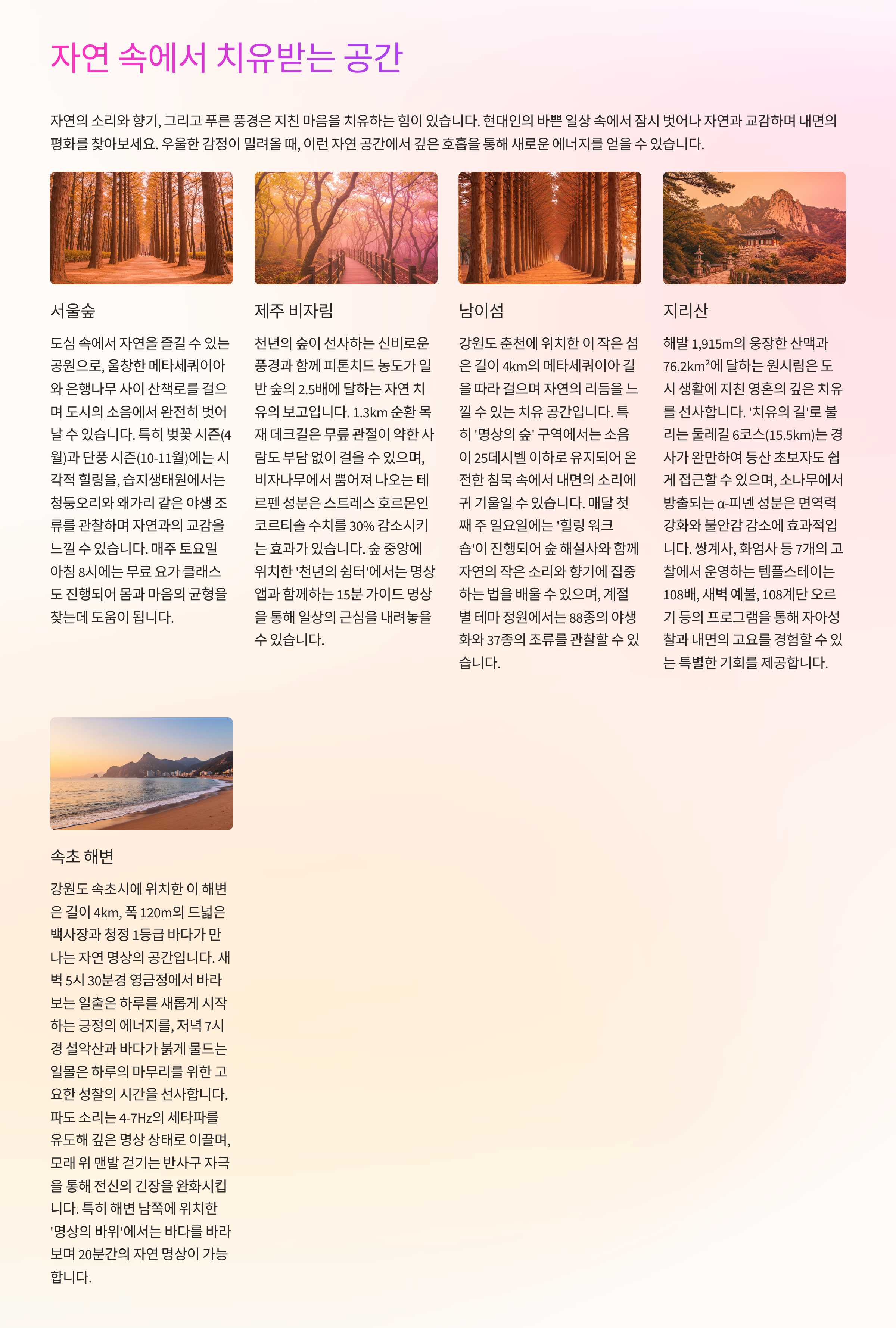 자연은 우리에게 가장 큰 치유를 선물하는 공간입니다. 특히 우울하고 힘들 때 숲길을 걷거나, 계곡에서 흐르는 물소리를 들으면 마음이 한결 가벼워지죠. 나무가 뿜어내는 피톤치드는 스트레스를 줄이고 심신을 안정시켜줍니다.