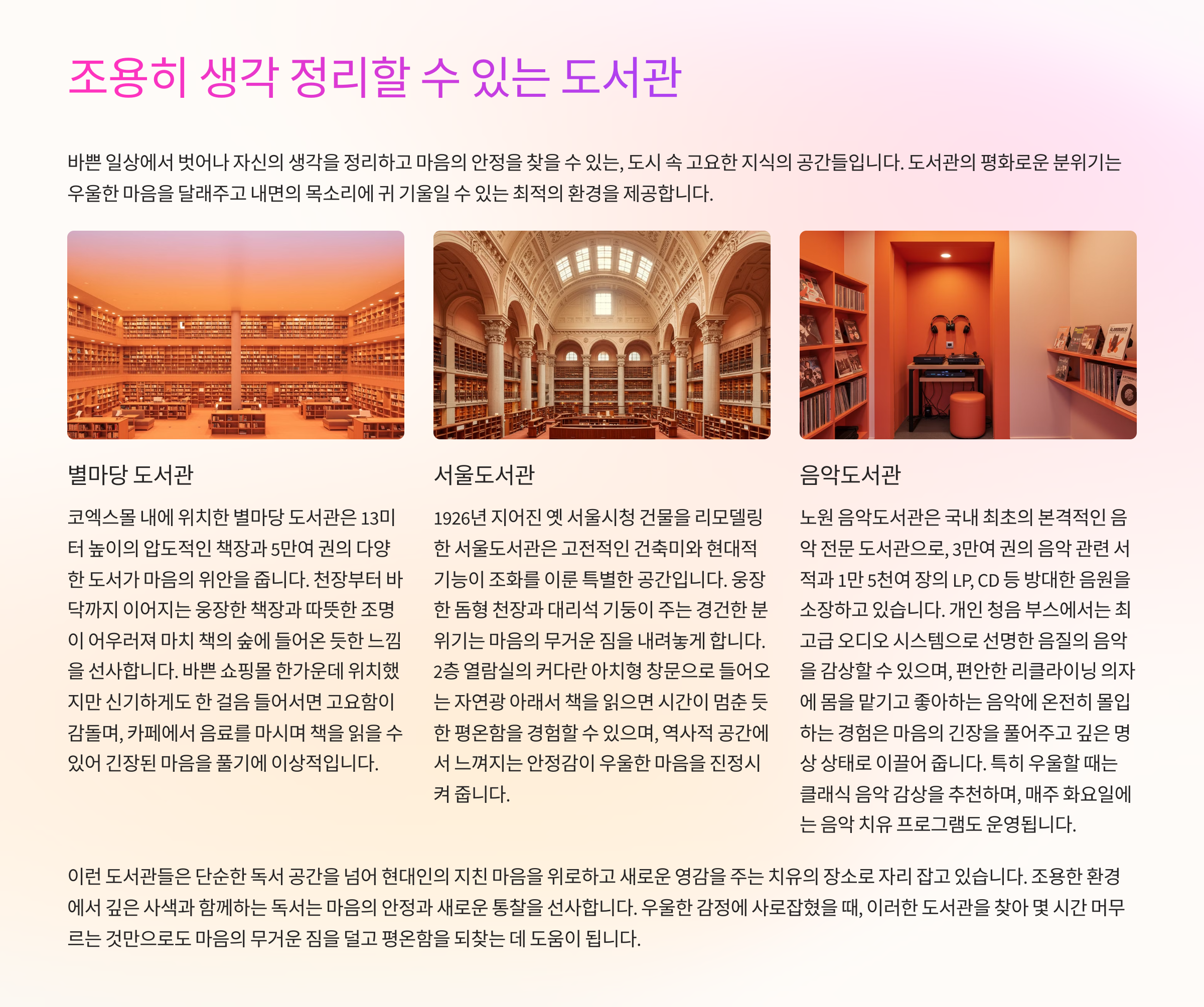 - 🎧 음악도서관 – 책과 함께 잔잔한 음악을 즐길 수 있는 공간