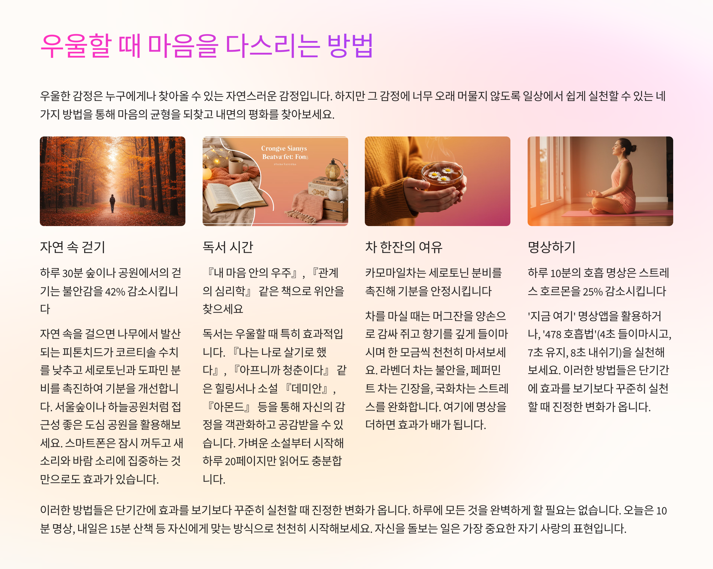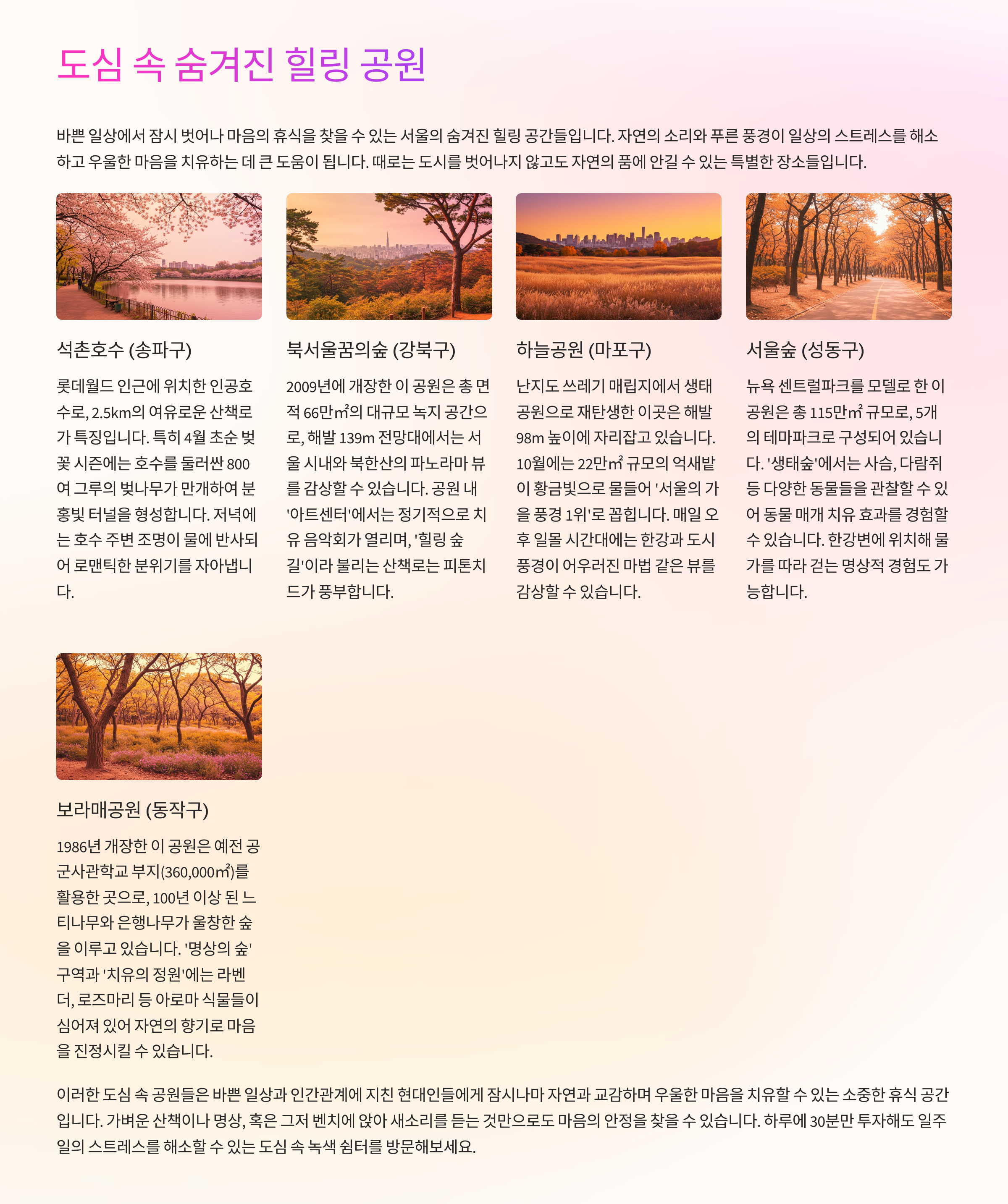 그리고 앞으로도 마음을 치유하는 다양한 장소와 방법을 소개해드릴 테니, 구독과 공유 부탁드립니다. 💜