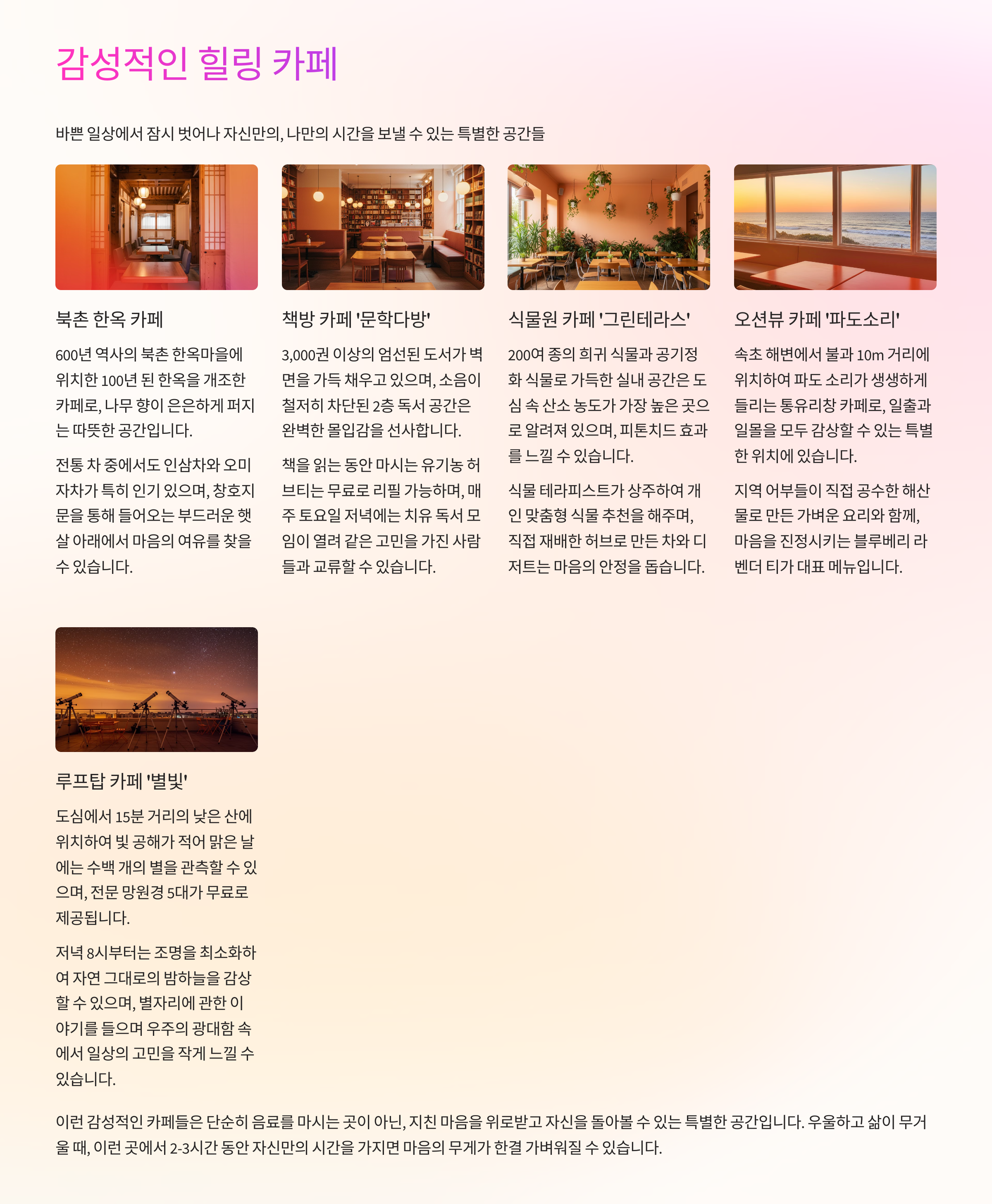 조용한 음악이 흐르고, 아늑한 조명 아래에서 커피 한 잔을 마시는 순간. 마음이 차분해지고 위로받는 기분이 들죠. 감성적인 카페는 생각을 정리하고 혼자만의 시간을 보내기에 최적의 공간입니다.