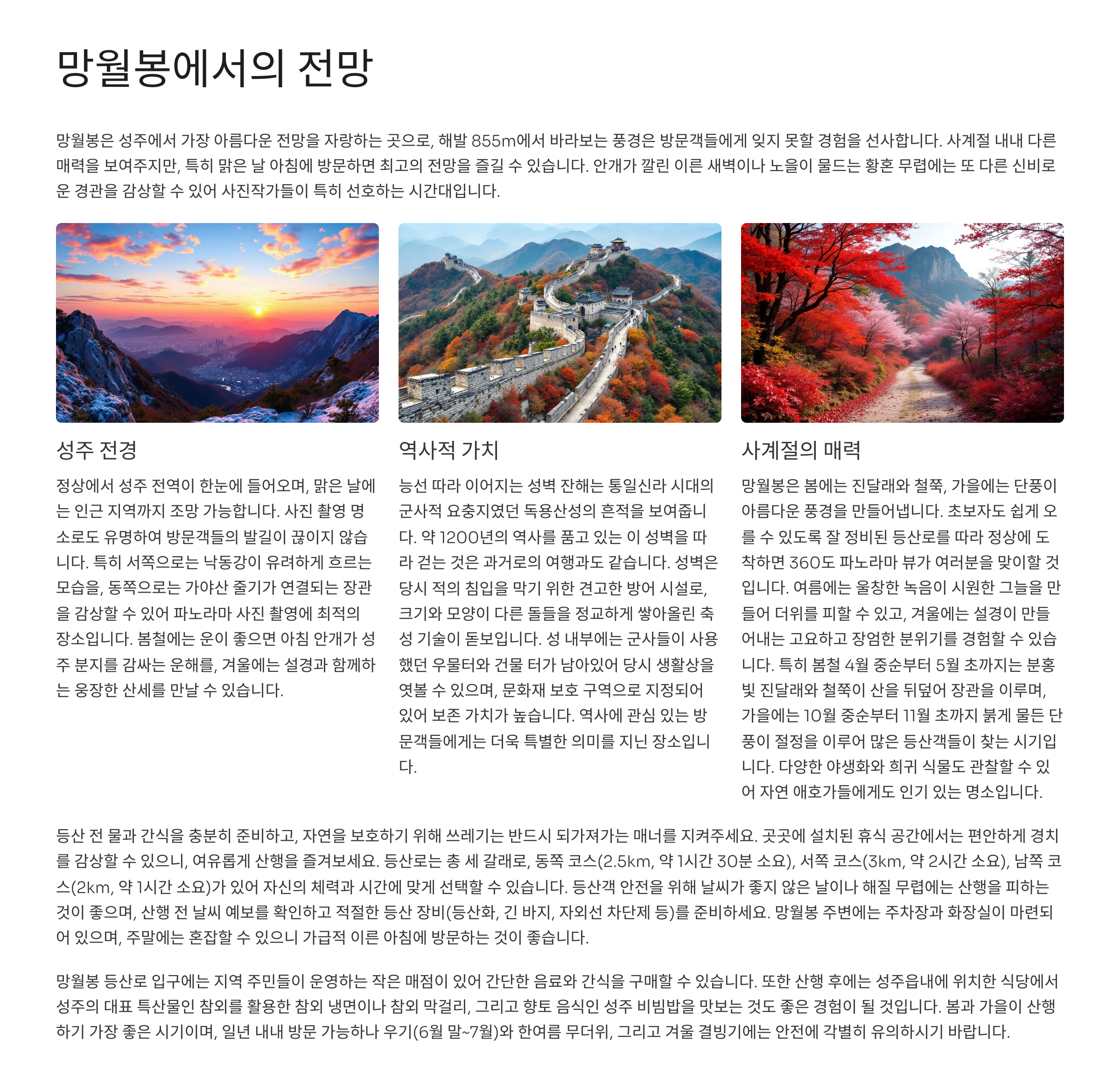 비교적 완만한 경사와 정비된 등산로 덕분에 초보자도 쉽게 오를 수 있으며, 정상 부근의 망월봉에 오르면 성주 전역이 한눈에 내려다보이는 장관이 펼쳐집니다