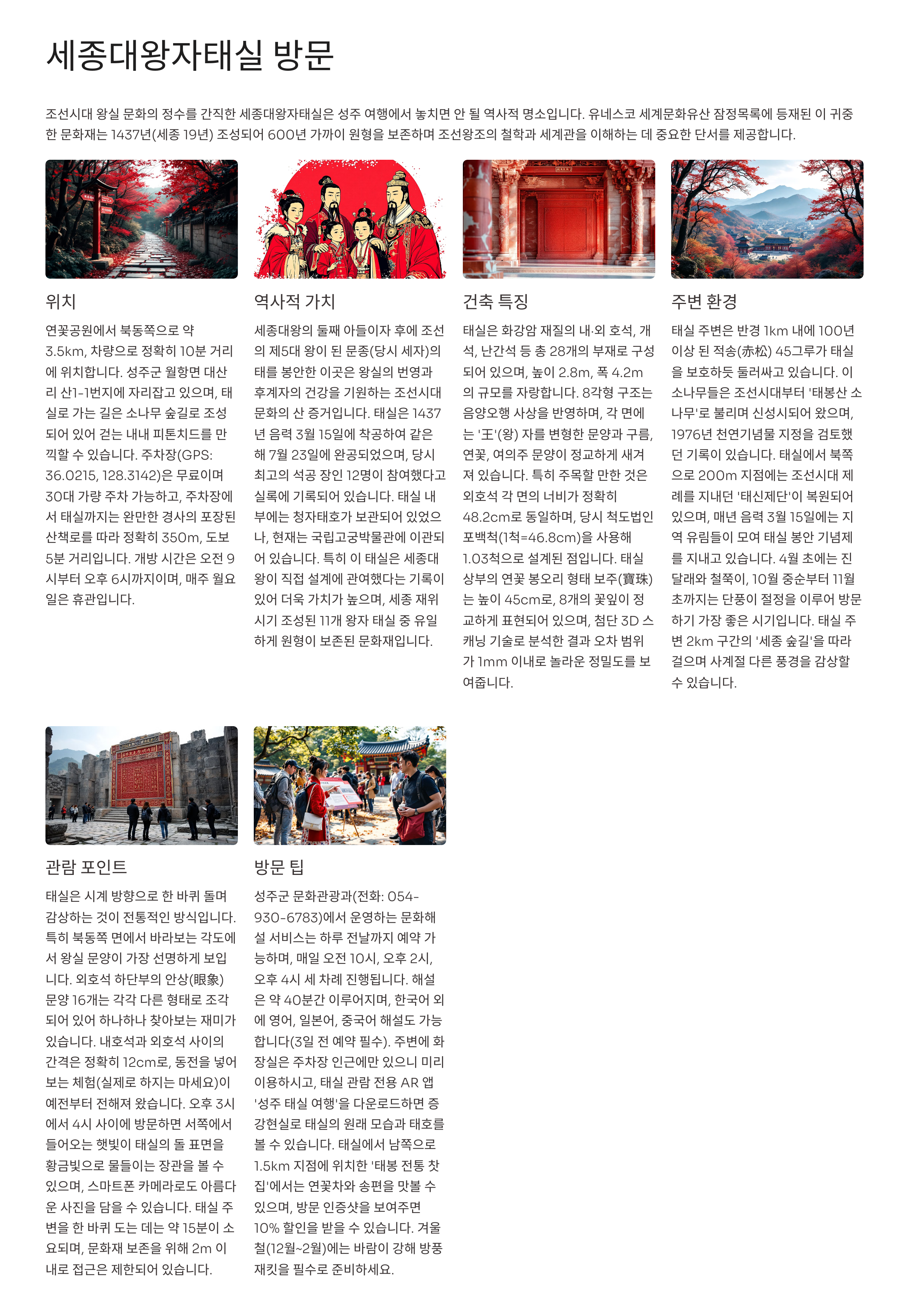 사진 명소로도 인기 있는 이곳은, 계절마다 다른 색감으로 바뀌는 숲과 태실의 고즈넉한 풍경이 어우러져 특별한 분위기를 자아냅니다.